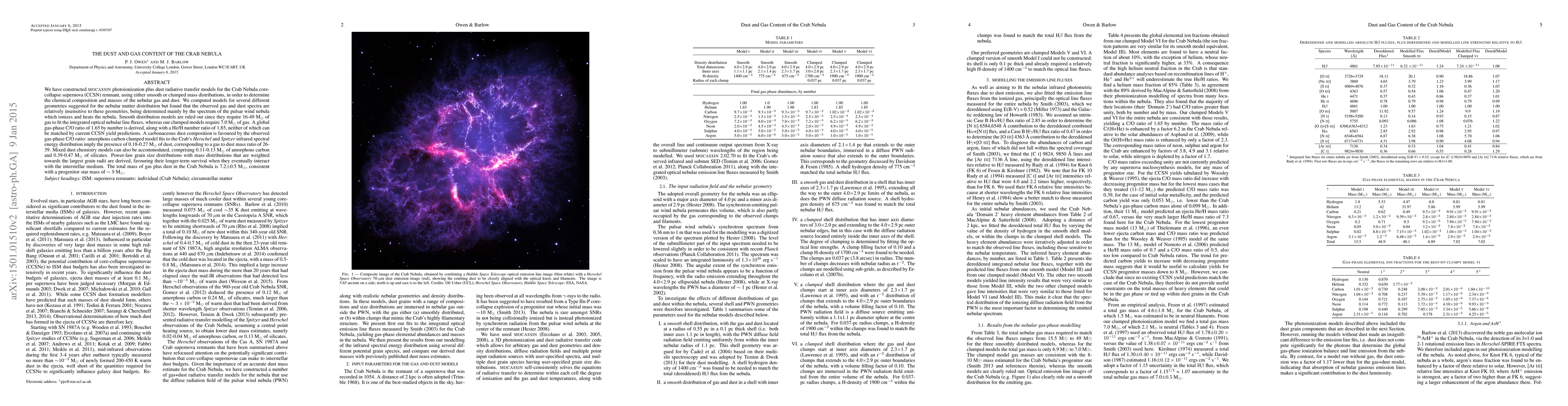 We have constructed MOCASSIN photoionization plus dust radiative transfer models for the Crab Nebula core-collapse supernova (CCSN) remnant, using either smooth or clumped mass distributions, in order to determine the chemical composition and masses of the nebular gas and dust. We computed models for several different geometries suggested for the nebular matter distribution but found that the observed gas and dust spectra are relatively insensitive to these geometries, being determined mainly by the spectrum of the pulsar wind nebula which ionizes and heats the nebula. Smooth distribution models are ruled out since they require 16-49 Msun of gas to fit the integrated optical nebular line fluxes, whereas our clumped models re quire 7.0 Msun of gas. A global gas-phase C/O ratio of 1.65 by number is derived, along with a He/H number ratio of 1.85, neither of which can be matched by current CCSN yield predictions. A carbonaceous dust composition is favoured by the observed gas-phase C/O ratio: amorphous carbon clumped model fits to the Crab's Herschel and Spitzer infrared spectral energy distribution imply the presence of 0.18-0.27 Msun of dust, corresponding to a gas to dust mass ratio of 26-39. Mixed dust chemistry models can also be accommodated, comprising 0.11-0.13 Msun of amorphous carbon and 0.39-0.47 Msun of silicates. Power-law grain size distributions with mass distributions that are weighted towards the largest grain radii are derived, favouring their longer-term survival when they eventually interact with the interstellar medium. The total mass of gas plus dust in the Crab Nebula is 7.2 +/- 0.5 Msun, consistent with a progenitor star mass of 9 Msun.