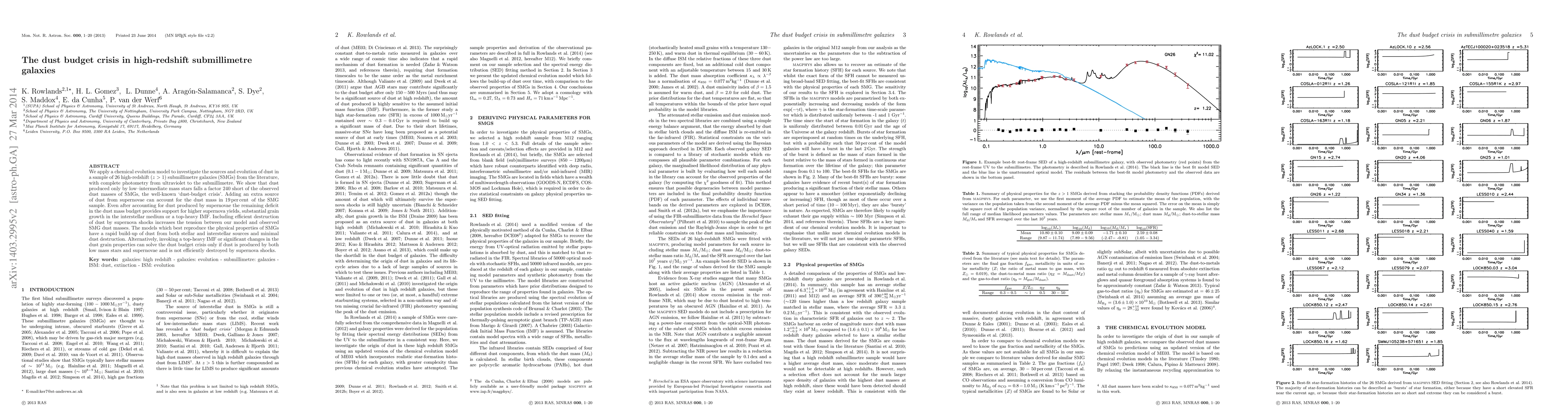 This research investigates the dust budget in high-redshift submillimetre galaxies (SMGs) using a chemical evolution model, revealing a significant deficit in dust production from low-mass stars alone. The study suggests that supernovae can partially resolve this "dust-budget crisis," but alternative explanations like higher supernova yields or grain growth are needed to fully account for observed dust masses.