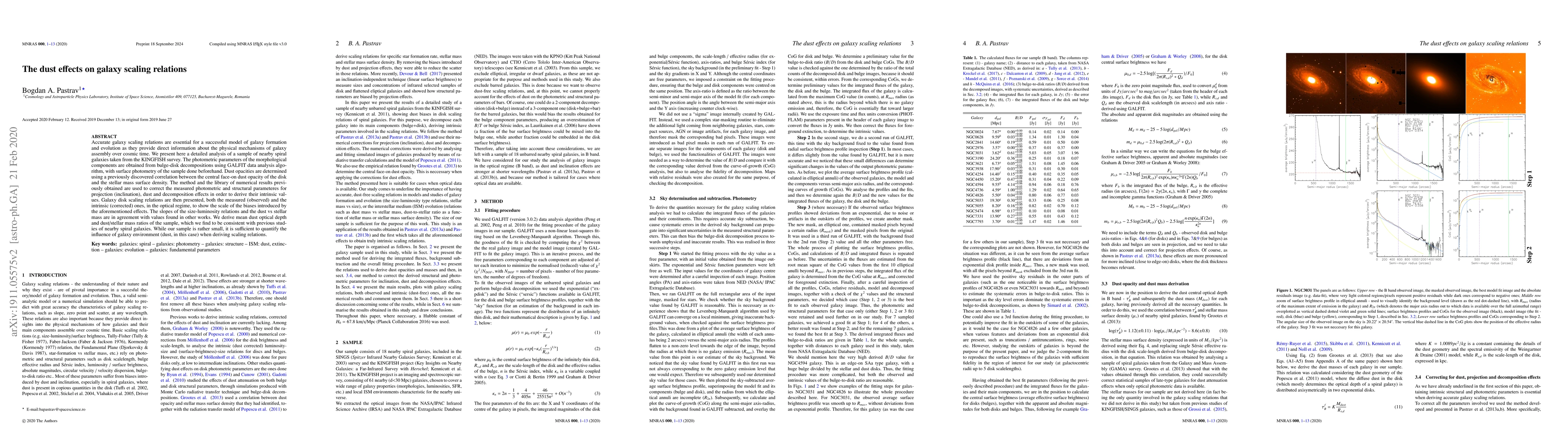 This study analyzes nearby spiral galaxies from the KINGFISH survey to understand dust effects on galaxy scaling relations. It corrects photometric and structural parameters for dust opacity, projection, and decomposition effects to derive intrinsic values, showing that dust significantly influences scaling relations.