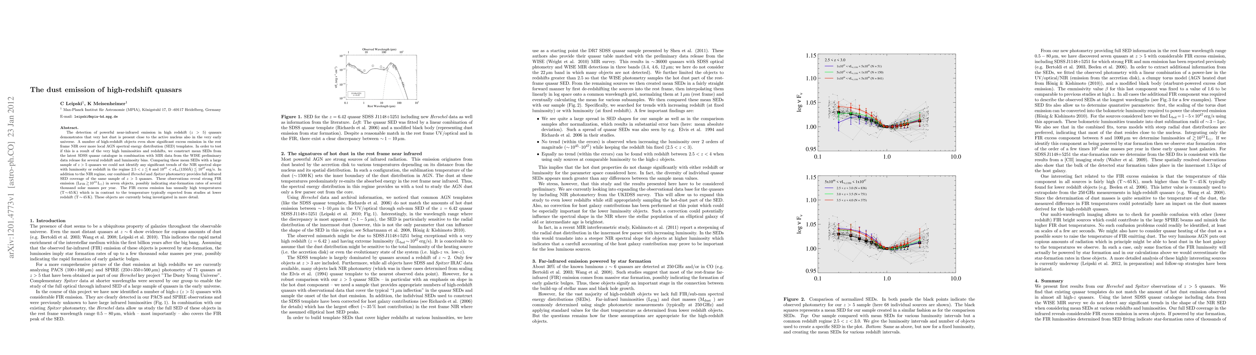 The detection of powerful near-infrared emission in high redshift (z>5) quasars demonstrates that very hot dust is present close to the active nucleus also in the very early universe. A number of high-redshift objects even show significant excess emission in the rest frame NIR over more local AGN spectral energy distribution (SED) templates. In order to test if this is a result of the very high luminosities and redshifts, we construct mean SEDs from the latest SDSS quasar catalogue in combination with MIR data from the WISE preliminary data release for several redshift and luminosity bins. Comparing these mean SEDs with a large sample of z>5 quasars we could not identify any significant trends of the NIR spectral slope with luminosity or redshift in the regime 2.5 < z < 6 and 10^45 < nuL_nu(1350AA) < 10^47 erg/s. In addition to the NIR regime, our combined Herschel and Spitzer photometry provides full infrared SED coverage of the same sample of z>5 quasars. These observations reveal strong FIR emission (L_FIR > 10^13 L_sun) in seven objects, possibly indicating star-formation rates of several thousand solar masses per year. The FIR excess emission has unusally high temperatures (T ~ 65 K) which is in contrast to the temperature typically expected from studies at lower redshift (T ~ 45 K). These objects are currently being investigated in more detail.
