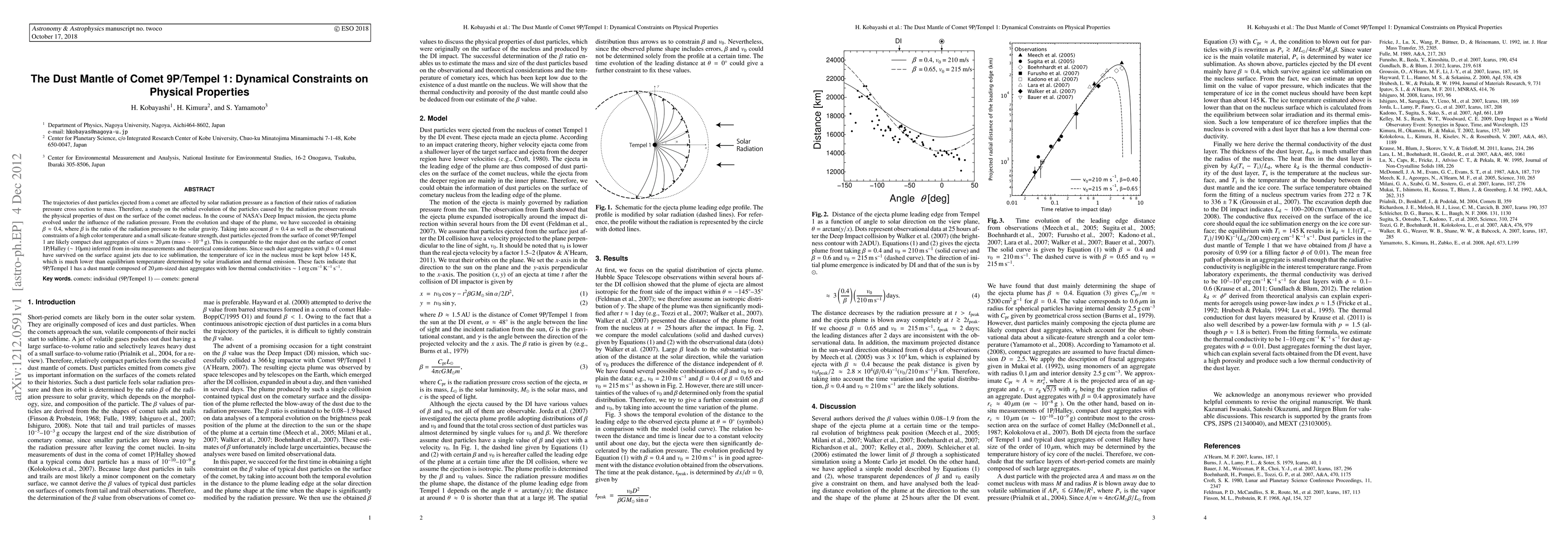 The study analyzes comet 9P/Tempel 1's dust mantle properties using solar radiation pressure effects on ejected dust particles from NASA's Deep Impact mission. Findings suggest the dust is composed of compact 20µm aggregates with low thermal conductivity, implying the comet's icy nucleus temperature must be below 145K to preserve this dust layer.