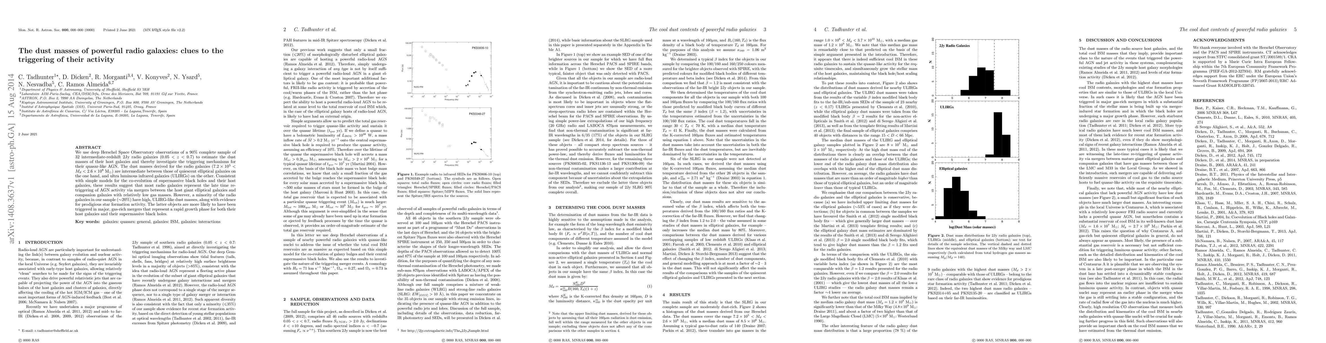 We use deep Herschel Space Observatory observations of a 90% complete sample of 32 intermediate-redshift 2Jy radio galaxies (0.05 < z < 0.7) to estimate the dust masses of their host galaxies and thereby investigate the triggering mechanisms for their quasar-like AGN. The dust masses derived for the radio galaxies (7.2x10^5 < M_d < 2.6x10^8 M_sun) are intermediate between those of quiescent elliptical galaxies on the one hand, and ultra luminous infrared galaxies (ULIRGs) on the other. Consistent with simple models for the co-evolution of supermassive black holes and their host galaxies, these results suggest that most of the radio galaxies represent the late time re-triggering of AGN activity via mergers between the host giant elliptical galaxies and companion galaxies with relatively low gas masses. However, a minority of the radio galaxies in our sample (~20%) have high, ULIRG-like dust masses, along with evidence for prodigious star formation activity. The latter objects are more likely to have been triggered in major, gas-rich mergers that represent a rapid growth phase for both their host galaxies and their supermassive black holes.