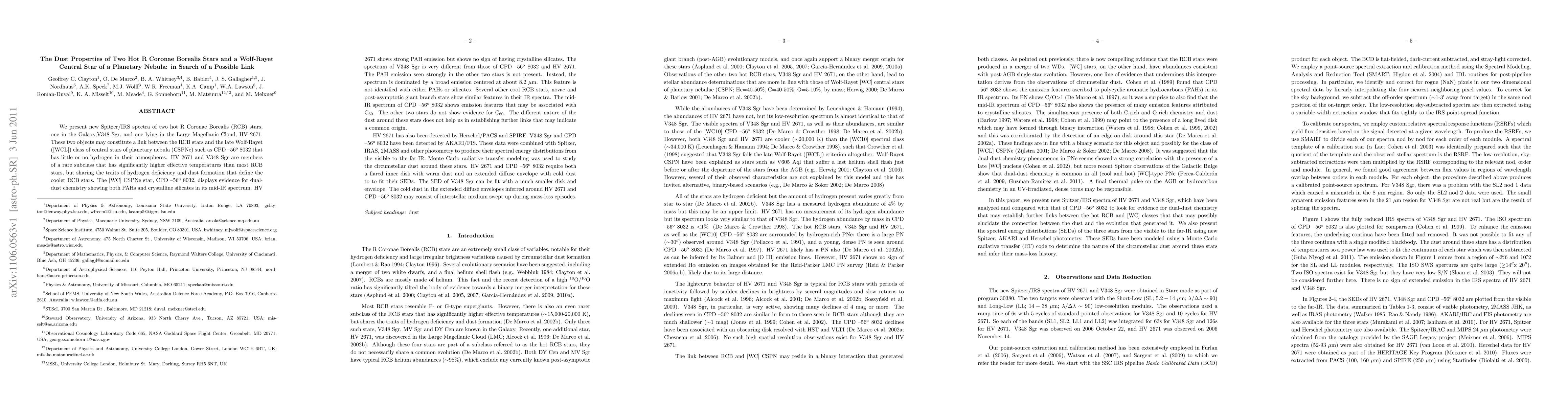 We present new Spitzer/IRS spectra of two hot R Coronae Borealis (RCB) stars, one in the Galaxy,V348 Sgr, and one lying in the LMC, HV 2671. These two objects may constitute a link between the RCB stars and the late Wolf-Rayet ([WCL]) class of central stars of planetary nebula (CSPNe) such as CPD -56 8032 that has little or no hydrogen in their atmospheres. HV 2671 and V348 Sgr are members of a rare subclass that has significantly higher effective temperatures than most RCB stars, but sharing the traits of hydrogen deficiency and dust formation that define the cooler RCB stars. The [WC] CSPNe star, CPD -56 8032, displays evidence for dual-dust chemistry showing both PAHs and crystalline silicates in its mid-IR spectrum. HV 2671 shows strong PAH emission but shows no sign of having crystalline silicates. The spectrum of V348 Sgr is very different from those of CPD -56 8032 and HV 2671. The PAH emission seen strongly in the other two stars is not present. Instead, the spectrum is dominated by a broad emission centered at about 8.2 micron. The mid-IR spectrum of CPD -56 8032 shows emission features that may be associated with C60. The other two stars do not show evidence for C60. HV 2671 has also been detected by Herschel/PACS and SPIRE. V348 Sgr and CPD -56 8032 have been detected by AKARI/FIS. These data were combined with Spitzer, IRAS, 2MASS and other photometry to produce their spectral energy distributions from the visible to the far-IR. Monte Carlo radiative transfer modeling was used to study the circumstellar dust around these stars. HV 2671 and CPD -56 8032 require both a flared inner disk with warm dust and an extended diffuse envelope with cold dust to to fit their SEDs. The SED of V348 Sgr can be fit with a much smaller disk and envelope.