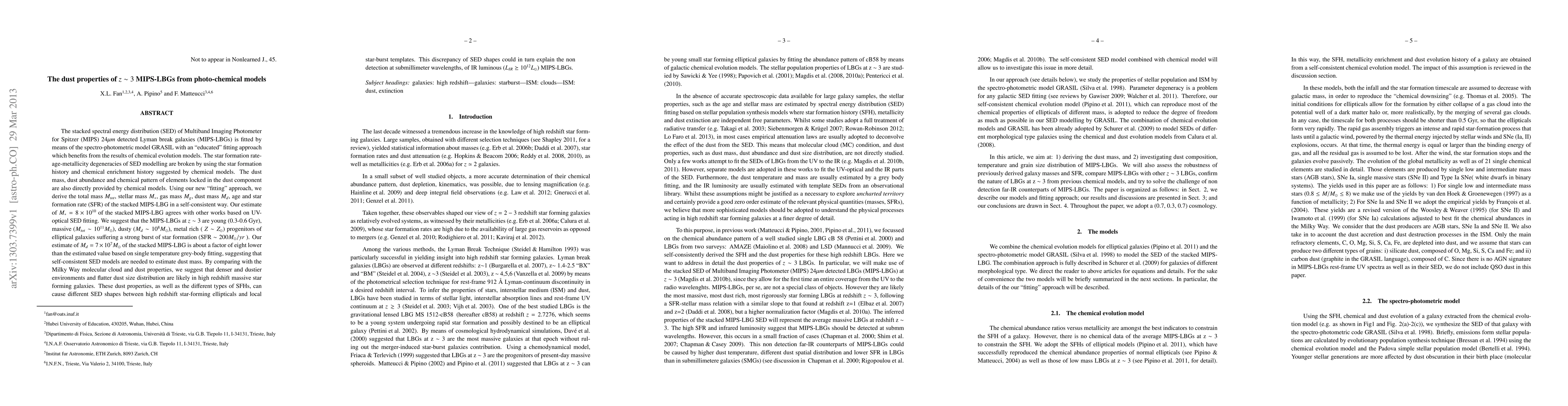 The stacked spectral energy distribution (SED) of Multiband Imaging Photometer for Spitzer (MIPS) 24$\mu m$ detected Lyman break galaxies (MIPS-LBGs) is fitted by means of spectro-photometric model GRASIL with an "educated" fitting approach which benefits from results of chemical evolution models. The star formation rate(SFR)-age-metallicity degeneracies of SED modelling are broken by using SFH and chemical enrichment history suggested by chemical models, which also provide dust mass, dust abundance and chemical elements locked in dust component. We derive the total mass $M_{tot}$, stellar mass $M_{\ast}$, gas mass $M_{g}$, dust mass $M_{d}$, age and SFR of the stacked MIPS-LBG in a self-consistent way. Our estimate of $M_{\ast}= 8\times 10^{10}$ agrees with other works based on UV-optical SED fitting. We suggest that MIPS-LBGs at $z\sim3$ are young (0.3-0.6 Gyr), massive ($M_{tot} \sim 10^{11} M_{\odot}$), dusty ($M_{d} \sim 10^{8} M_{\odot}$), metal rich ($Z \sim Z_{\odot} $) progenitors of elliptical galaxies suffering a strong burst of star formation (SFR $\sim 200 M_{\odot}/yr$). Our estimate of $M_{d}=7 \times 10^{7} M_{\odot}$ of the stacked MIPS-LBG is about a factor of eight lower than the estimated value based on single temperature grey-body fitting, suggesting that self-consistent SED models are needed to estimate dust mass. By comparing with the Milky Way molecular cloud and dust properties, we suggest that denser and dustier environments and flatter dust size distribution are likely in high redshift massive star forming galaxies. These dust properties, as well as the different types of SFHs, can cause different SED shapes between high redshift star-forming ellipticals and local star-burst templates. This discrepancy of SED shapes could in turn explain the non detection at submillimeter wavelengths, of IR luminous ($L_{IR} \succeq 10^{12} L_{\odot} $) MIPS-LBGs.