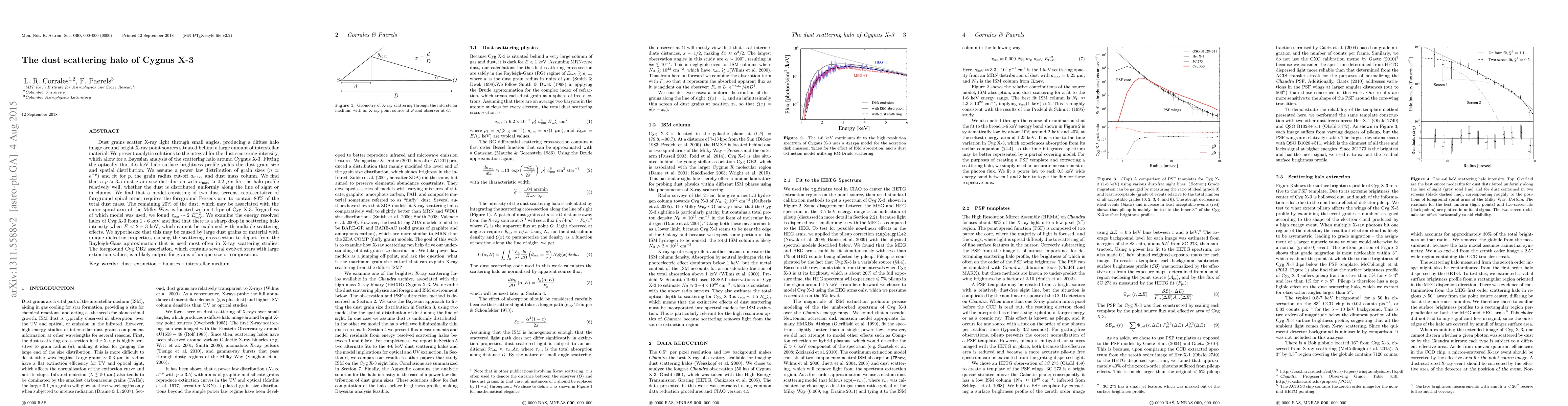 This paper analyzes the dust scattering halo around Cygnus X-3, finding a dust grain size distribution with a power law index of approximately 3.5 and a maximum radius of 0.2 µm. The study suggests that the majority of dust is in the Perseus arm, with a notable sharp drop in scattering intensity below 2-3 keV, potentially due to large grains or unusual material properties.