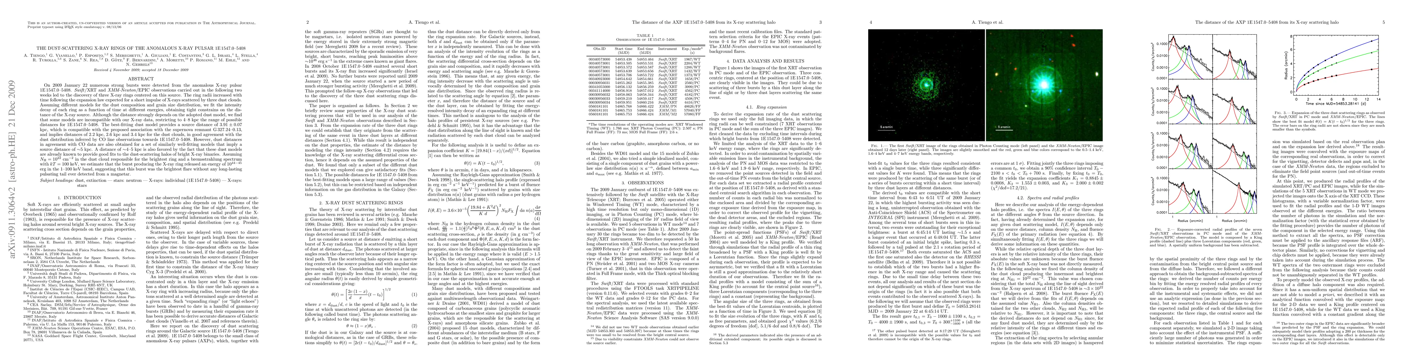 On 2009 January 22 numerous strong bursts were detected from the anomalous X-ray pulsar 1E 1547.0-5408. Swift/XRT and XMM-Newton/EPIC observations carried out in the following two weeks led to the discovery of three X-ray rings centered on this source. The ring radii increased with time following the expansion law expected for a short impulse of X-rays scattered by three dust clouds. Assuming different models for the dust composition and grain size distribution, we fit the intensity decay of each ring as a function of time at different energies, obtaining tight constrains on the distance of the X-ray source. Although the distance strongly depends on the adopted dust model, we find that some models are incompatible with our X-ray data, restricting to 4-8 kpc the range of possible distances for 1E 1547.0-5408. The best-fitting dust model provides a source distance of 3.91 +/- 0.07 kpc, which is compatible with the proposed association with the supernova remnant G 327.24-0.13, and implies distances of 2.2 kpc, 2.6 kpc and 3.4 kpc for the dust clouds, in good agreement with the dust distribution inferred by CO line observations towards 1E 1547.0-5408. However, dust distances in agreement with CO data are also obtained for a set of similarly well-fitting models that imply a source distance of about 5 kpc. A distance of about 4-5 kpc is also favored by the fact that these dust models are already known to provide good fits to the dust-scattering halos of bright X-ray binaries.