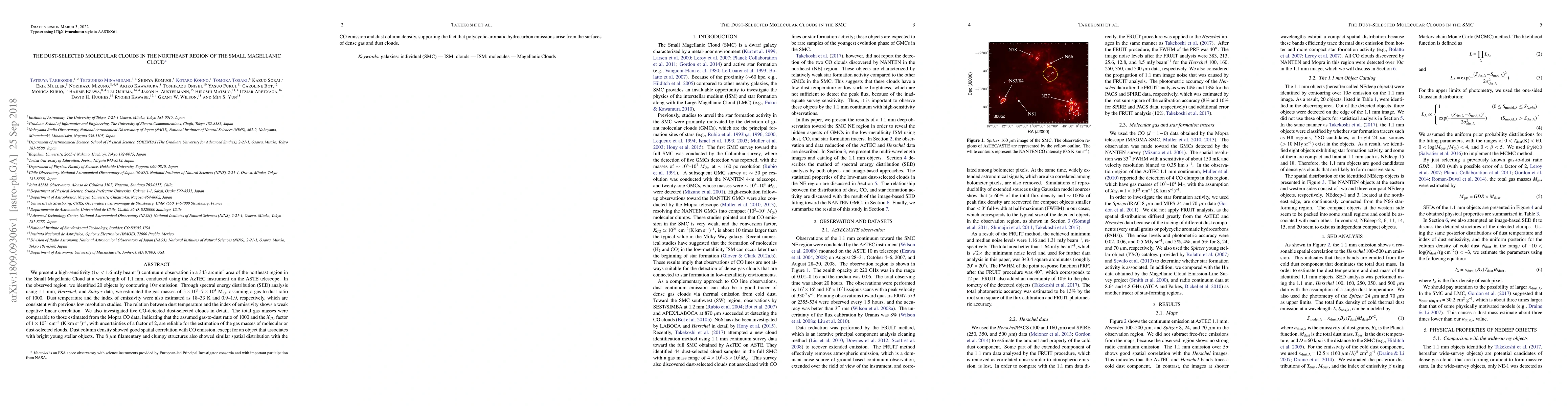 We present a high-sensitivity ($1\sigma<1.6~\mathrm{mJy~beam^{-1}}$) continuum observation in a 343 arcmin$^2$ area of the northeast region in the Small Magellanic Cloud at a wavelength of 1.1 mm, conducted using the AzTEC instrument on the ASTE telescope. In the observed region, we identified 20 objects by contouring $10\sigma$ emission. Through spectral energy distribution (SED) analysis using 1.1 mm, $Herschel$, and $Spitzer$ data, we estimated the gas masses of $5\times 10^3-7\times 10^4~\mathrm{M_\odot}$, assuming a gas-to-dust ratio of 1000. Dust temperature and the index of emissivity were also estimated as $18-33$ K and $0.9-1.9$, respectively, which are consistent with previous low resolution studies. The relation between dust temperature and the index of emissivity shows a weak negative linear correlation. We also investigated five CO-detected dust-selected clouds in detail. The total gas masses were comparable to those estimated from the Mopra CO data, indicating that the assumed gas-to-dust ratio of 1000 and the $X_\mathrm{CO}$ factor of $1\times10^{21}~\mathrm{cm^{-2}~(K~km~s^{-1})^{-1}}$, with uncertainties of a factor of 2, are reliable for the estimation of the gas masses of molecular or dust-selected clouds. Dust column density showed good spatial correlation with CO emission, except for an object that associates with bright young stellar objects. The $8~\mathrm{\mu m}$ filamentary and clumpy structures also showed similar spatial distribution with the CO emission and dust column density, supporting the fact that polycyclic aromatic hydrocarbon emissions arise from the surfaces of dense gas and dust clouds.