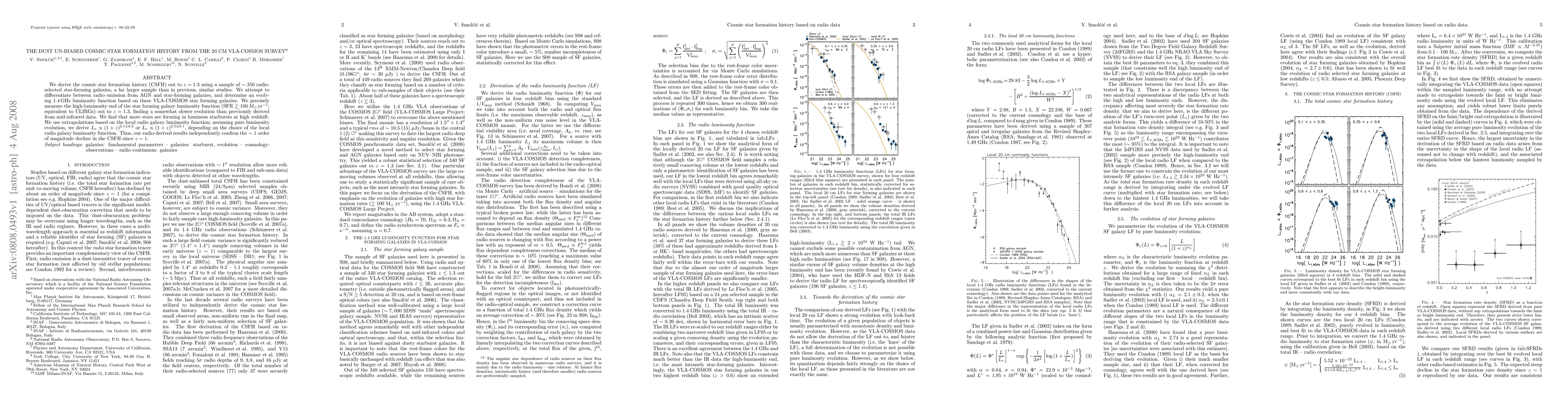 This paper presents a detailed cosmic star formation history (CSFH) up to z=1.3 derived from a large sample of radio-selected star-forming galaxies using the VLA-COSMOS survey. The study differentiates between radio emissions from AGN and star-forming galaxies, revealing a slower evolution in high-luminosity star-forming galaxies compared to mid-infrared data.