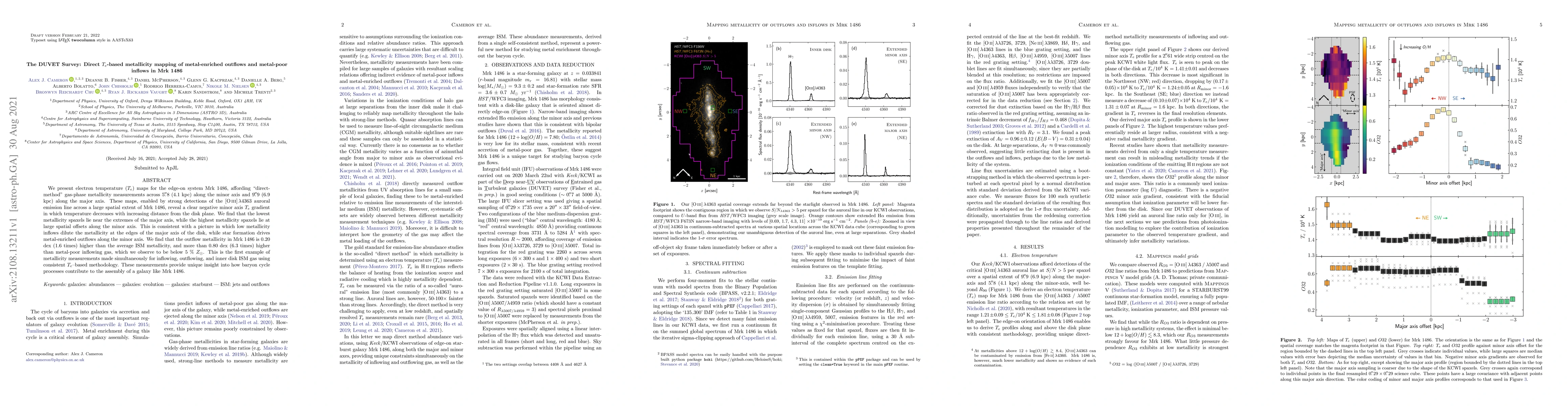 The DUVET Survey provides $T_e$-based metallicity maps for Mrk 1486, revealing a negative minor axis temperature gradient and higher metallicity in outflows along the minor axis compared to metal-poor inflows along the major axis. This suggests distinct baryon cycle processes shaping the galaxy's metallicity distribution.