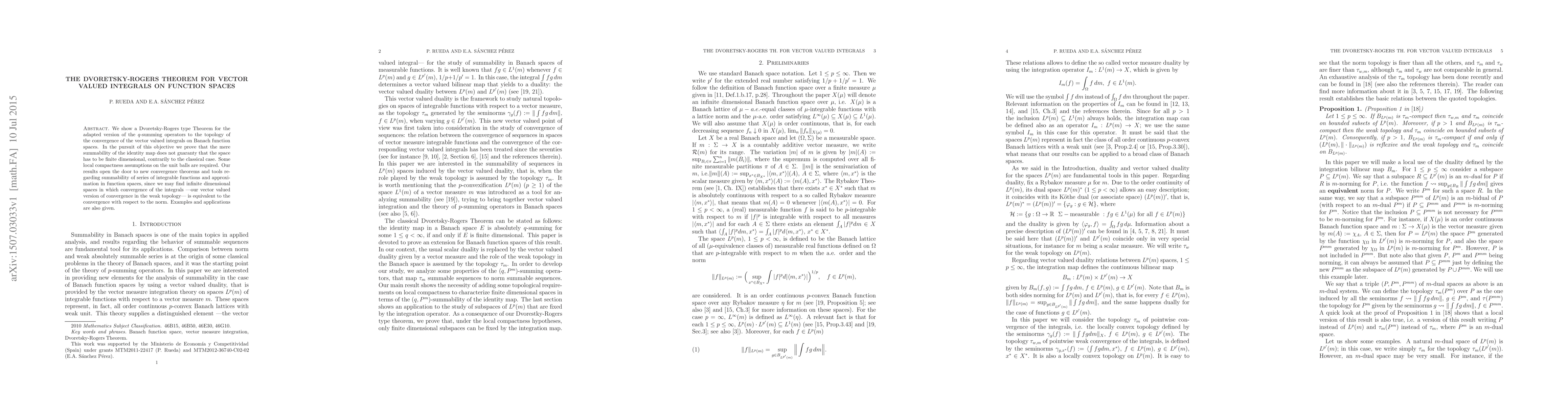 This paper establishes a Dvoretsky-Rogers type theorem for vector valued integrals on Banach function spaces, demonstrating that summability of the identity map does not necessitate finite dimensionality, unlike in classical cases. It requires local compactness assumptions and opens new avenues for convergence theorems and approximation tools in function spaces.