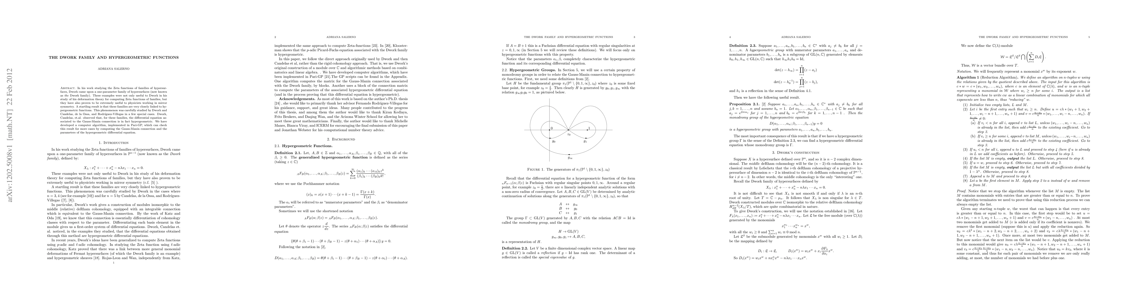 This paper explores the connection between Dwork's family of hypersurfaces and hypergeometric functions, revealing that the differential equation associated with the Gauss-Manin connection is hypergeometric. A computer algorithm in Pari-GP is developed to verify this relationship in additional cases.