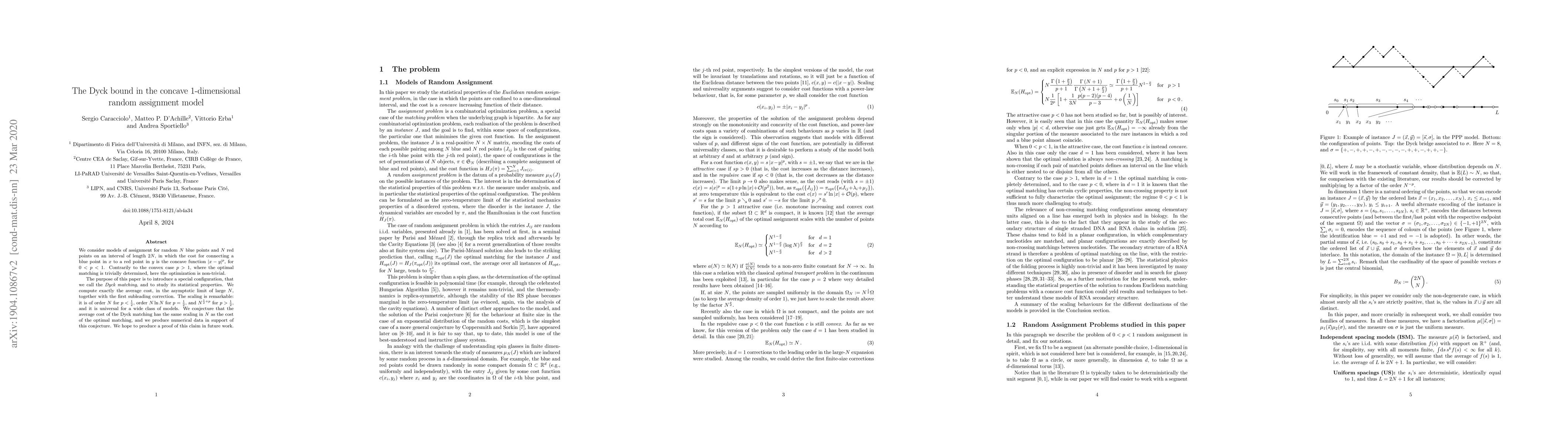 1$, where the optimal matching is trivially determined, here the optimization is non-trivial. The purpose of this paper is to introduce a special configuration, that we call the \emph{Dyck matching}, and to study its statistical properties. We compute exactly the average cost, in the asymptotic limit of large $N$, together with the first subleading correction. The scaling is remarkable: it is of order $N$ for $p<\frac{1}{2}$, order $N \ln N$ for $p=\frac{1}{2}$, and $N^{\frac{1}{2}+p}$ for $p>\frac{1}{2}$, and it is universal for a wide class of models. We conjecture that the average cost of the Dyck matching has the same scaling in $N$ as the cost of the optimal matching, and we produce numerical data in support of this conjecture. We hope to produce a proof of this claim in future work.