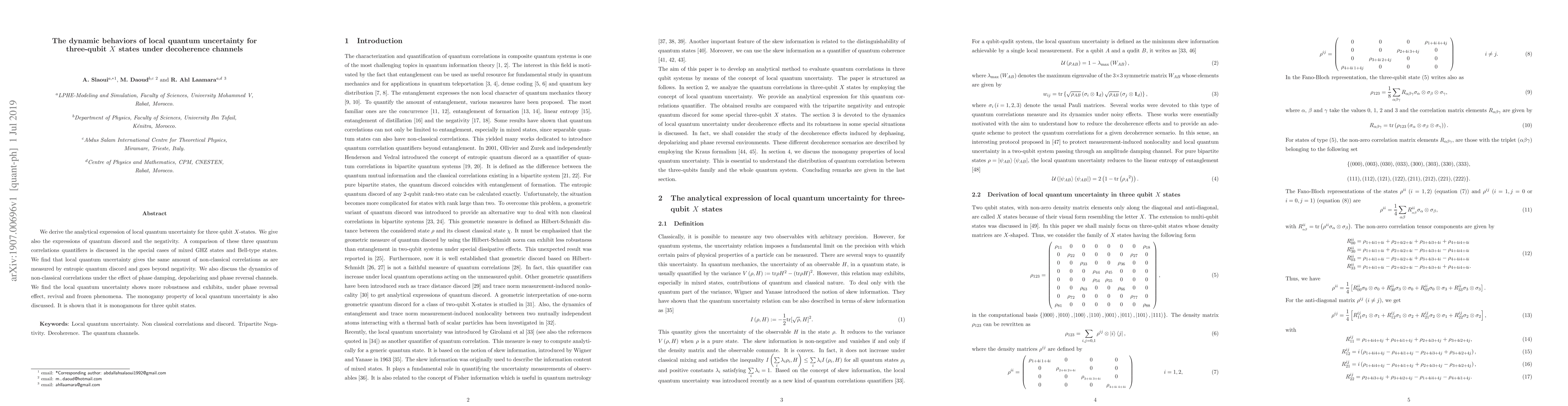 This paper derives analytical expressions for local quantum uncertainty, quantum discord, and negativity in three-qubit X-states, comparing these measures in mixed GHZ and Bell-type states. It finds local quantum uncertainty to be robust and monogamous, showing revival and frozen phenomena under decoherence channels.