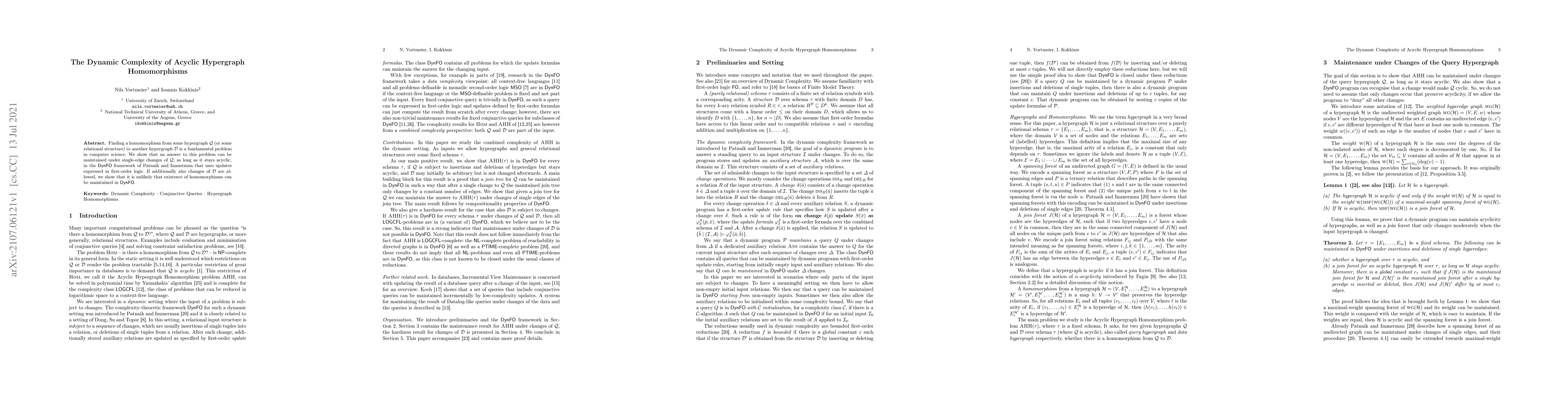 The paper introduces a method for maintaining hypergraph homomorphisms in DynFO under single-edge changes to acyclic query hypergraphs, along with a proof of hardness for maintaining AHH under changes to the data hypergraph D.