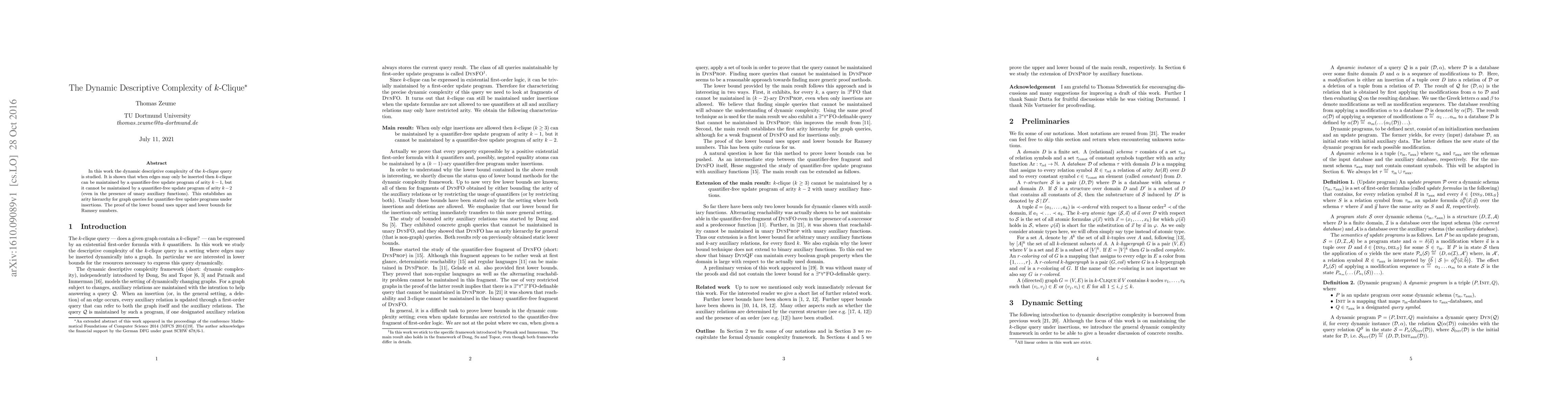 The paper introduces a dynamic descriptive complexity characterization of the k-clique query under insertions, establishing an arity hierarchy for graph queries for DynProp.
