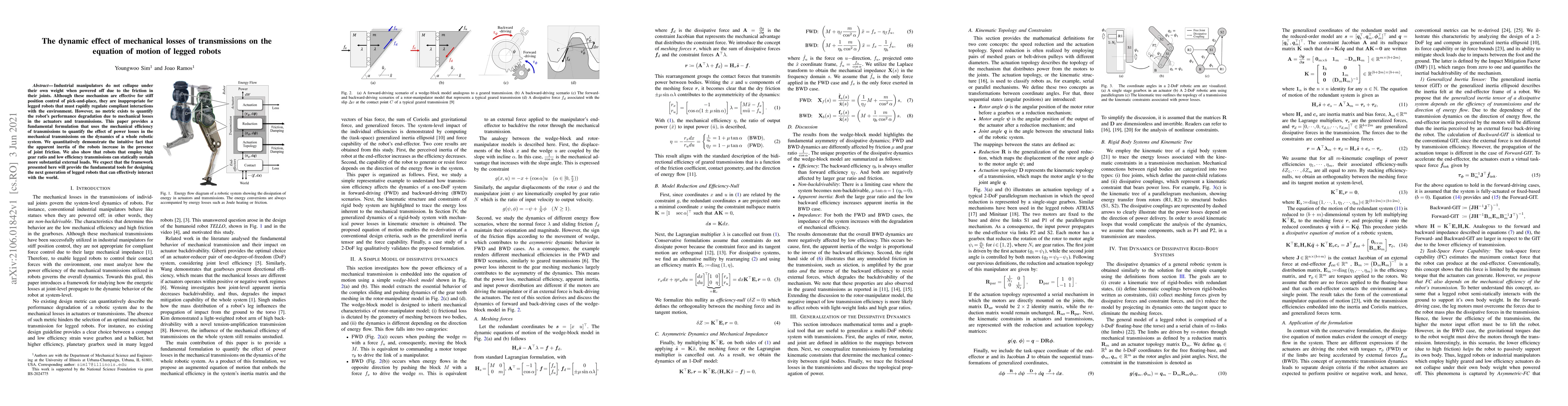 Industrial manipulators do not collapse under their own weight when powered off due to the friction in their joints. Although these mechanism are effective for stiff position control of pick-and-place, they are inappropriate for legged robots that must rapidly regulate compliant interactions with the environment. However, no metric exists to quantify the robot's performance degradation due to mechanical losses in the actuators and transmissions. This paper provides a fundamental formulation that uses the mechanical efficiency of transmissions to quantify the effect of power losses in the mechanical transmissions on the dynamics of a whole robotic system. We quantitatively demonstrate the intuitive fact that the apparent inertia of the robots increase in the presence of joint friction. We also show that robots that employ high gear ratio and low efficiency transmissions can statically sustain more substantial external loads. We expect that the framework presented here will provide the fundamental tools for designing the next generation of legged robots that can effectively interact with the world.