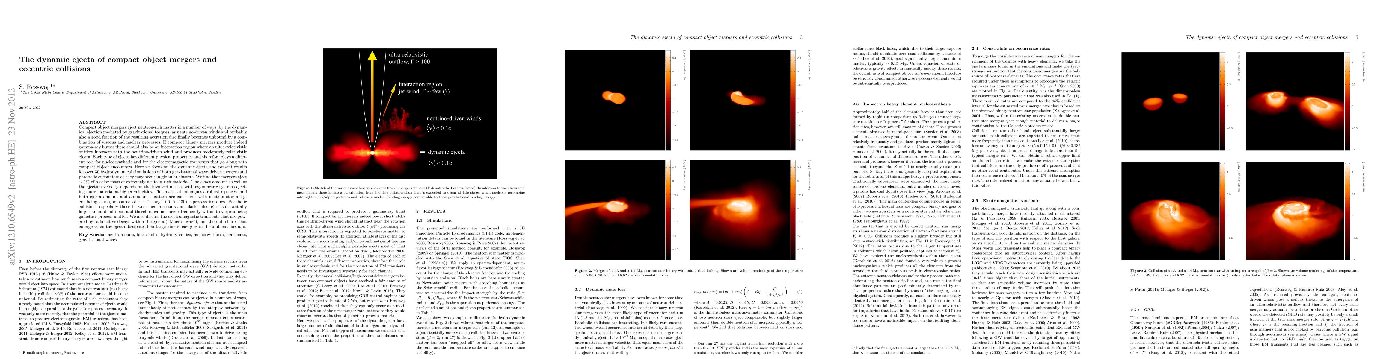 Compact object mergers eject neutron-rich matter in a number of ways: by the dynamical ejection mediated by gravitational torques, as neutrino-driven winds and probably also a good fraction of the resulting accretion disc finally becomes unbound by a combination of viscous and nuclear processes. If compact binary mergers produce indeed gamma-ray bursts there should also be an interaction region where an ultra-relativistic outflow interacts with the neutrino-driven wind and produces moderately relativistic ejecta. Each type of ejecta has different physical properties and therefore plays a different role for nucleosynthesis and for the electromagnetic transients that go along with compact object encounters. Here we focus on the dynamic ejecta and present results for over 30 hydrodynamical simulations of both gravitational wave-driven mergers and parabolic encounters as they may occur in globular clusters. We find that mergers eject $\sim 1$% of a solar mass of extremely neutron-rich material. The exact amount as well as the ejection velocity depends on the involved masses with asymmetric systems ejecting more material at higher velocities. This material undergoes a robust r-process and both ejecta amount and abundance pattern are consistent with neutron star mergers being a major source of the "heavy" ($A>130$) r-process isotopes. Parabolic collisions, especially those between neutron stars and black holes, eject substantially larger amounts of mass and therefore cannot occur frequently without overproducing galactic r-process matter. We also discuss the electromagnetic transients that are powered by radioactive decays within the ejecta ("Macronovae"), and the radio flares that emerge when the ejecta dissipate their large kinetic energies in the ambient medium.