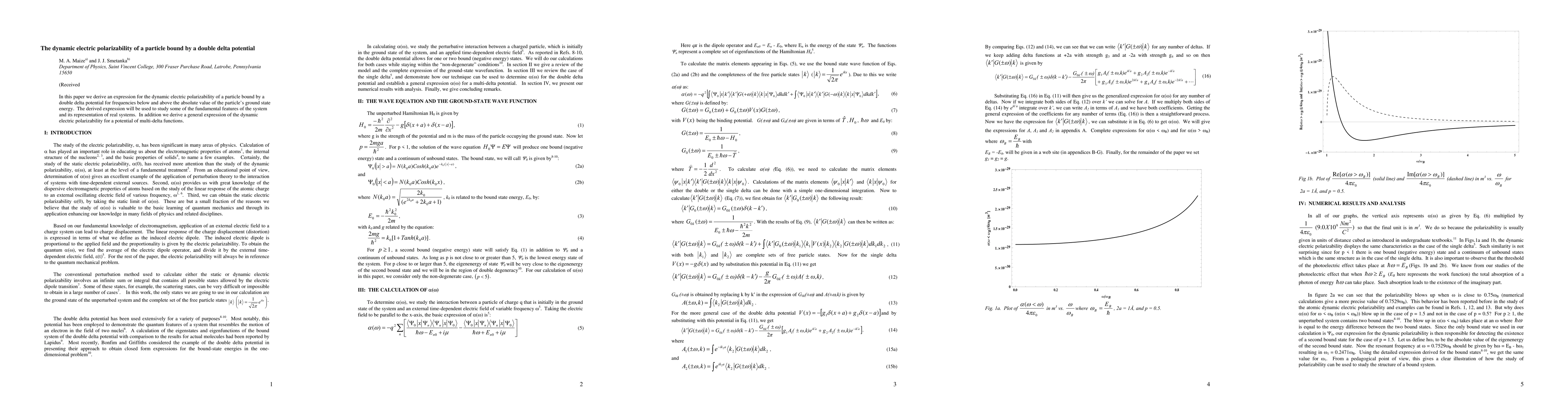 In this paper we derive an expression for the dynamic electric polarizability of a particle bound by a double delta potential for frequencies below and above the absolute value of the particle's ground state energy. The derived expression will be used to study some of the fundamental features of the system and its representation of real systems. In addition we derive a general expression of the dynamic electric polarizability for a potential of multi-delta functions.