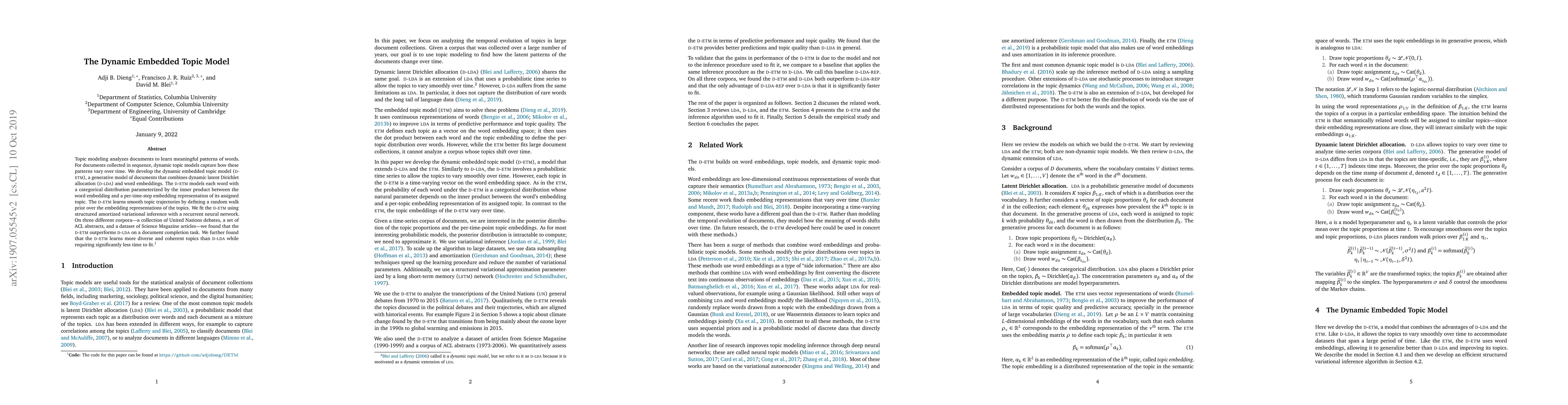 The dynamic embedded topic model (D-ETM) combines dynamic latent Dirichlet allocation with word embeddings to capture time-varying word patterns in sequential documents. The D-ETM outperforms dynamic latent Dirichlet allocation in document completion and learns more diverse and coherent topics more efficiently.