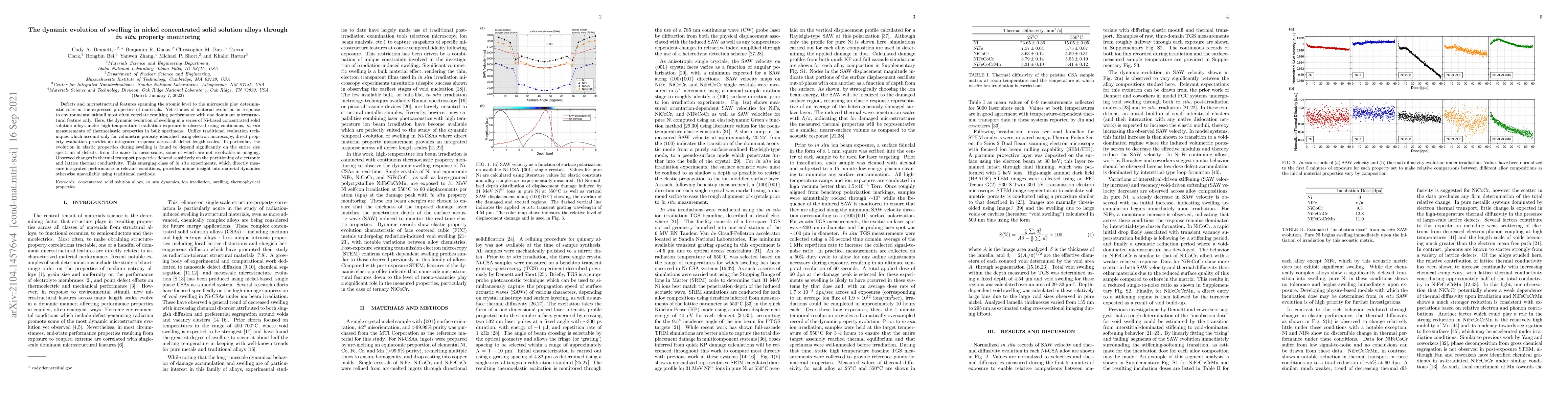 This study investigates the dynamic evolution of swelling in nickel-based concentrated solid solution alloys under high-temperature irradiation using continuous in situ thermoelastic property monitoring. The research reveals that swelling's impact on elastic properties is influenced by the entire spectrum of defects, from nano to meso scales, offering insights beyond traditional electron microscopy-based evaluations.