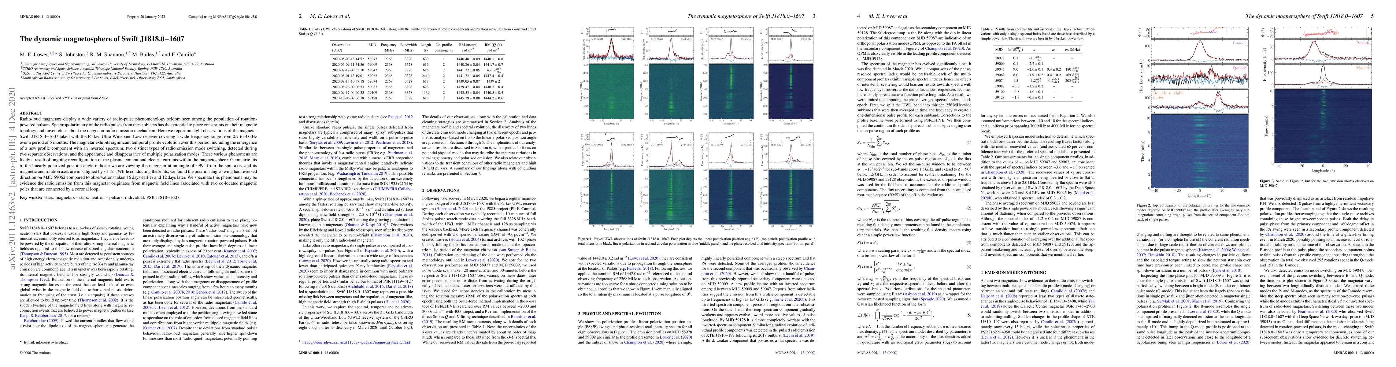 The study of magnetar Swift J1818.0$-$1607 using Parkes Ultra-Wideband Low receiver over 5 months revealed significant magnetosphere changes, including new profile components, emission mode switching, and polarization mode variations. The findings suggest ongoing magnetospheric plasma reconfiguration, with the magnetar viewed at ~99° from the spin axis and magnetic/rotation axes misaligned by ~112°. An unusual position angle swing reversal implies radio emission from magnetic field lines linking two co-located magnetic poles via a coronal loop.
