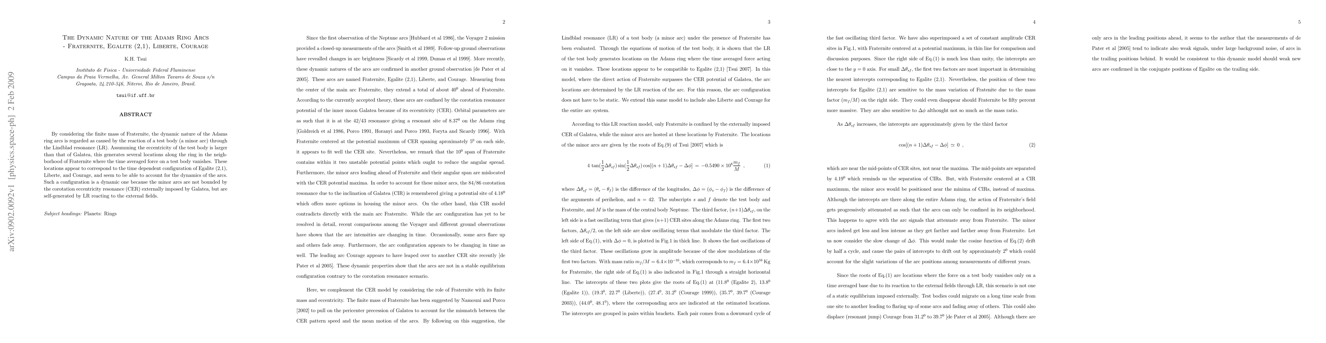 By considering the finite mass of Fraternite, the dynamic nature of the Adams ring arcs is regarded as caused by the reaction of a test body (a minor arc) through the Lindblad resonance (LR). Assumming the eccentricity of the test body is larger than that of Galatea, this generates several locations along the ring in the neighborhood of Fraternite where the time averaged force on a test body vanishes. These locations appear to correspond to the time dependent configuration of Egalite (2,1), Liberte, and Courage, and seem to be able to account for the dynamics of the arcs. Such a configuration is a dynamic one because the minor arcs are not bounded by the corotation eccentricity resonance (CER) externally imposed by Galatea, but are self-generated by LR reacting to the external fields.