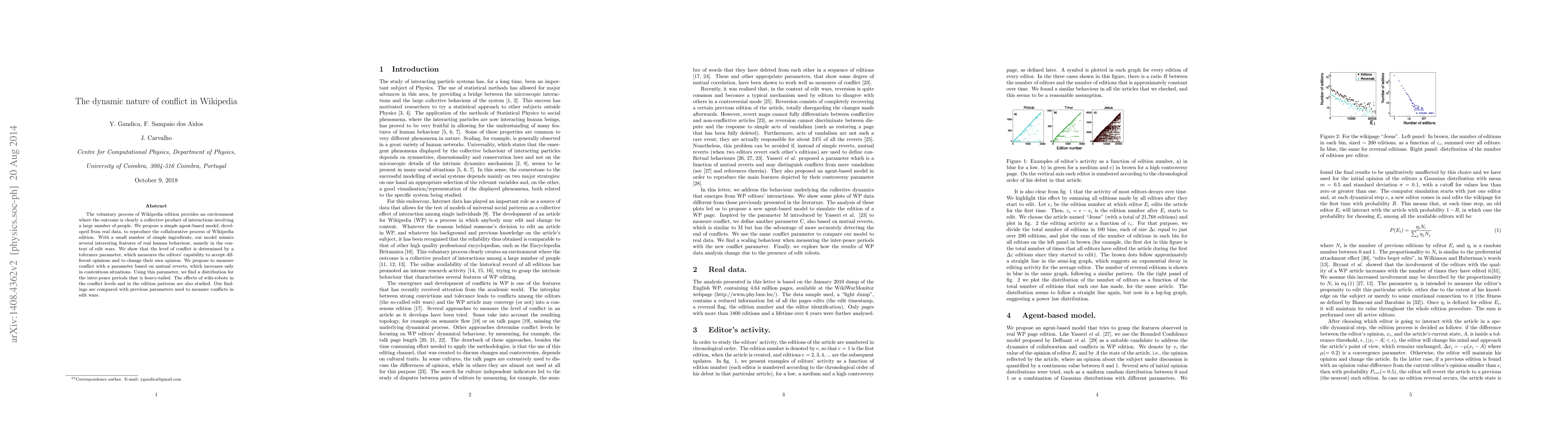 This paper develops an agent-based model to simulate Wikipedia's collaborative editing process, focusing on conflict dynamics, particularly edit wars. It finds that conflict levels depend on editors' tolerance for differing opinions and introduces a conflict parameter based on mutual reverts, revealing a heavy-tailed distribution for inter-peace periods.