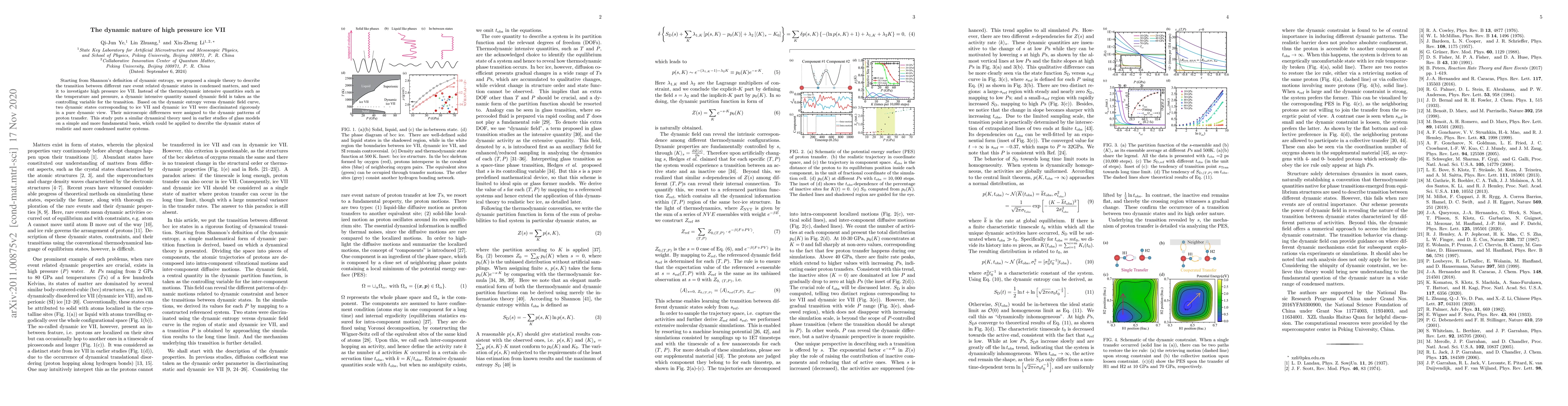 This paper proposes a theory based on dynamic entropy to describe transitions between dynamic states in condensed matter, focusing on high pressure ice VII. It introduces a dynamic field as a controlling variable, distinguishing between ice VII and dynamic ice VII based on proton transfer dynamics.