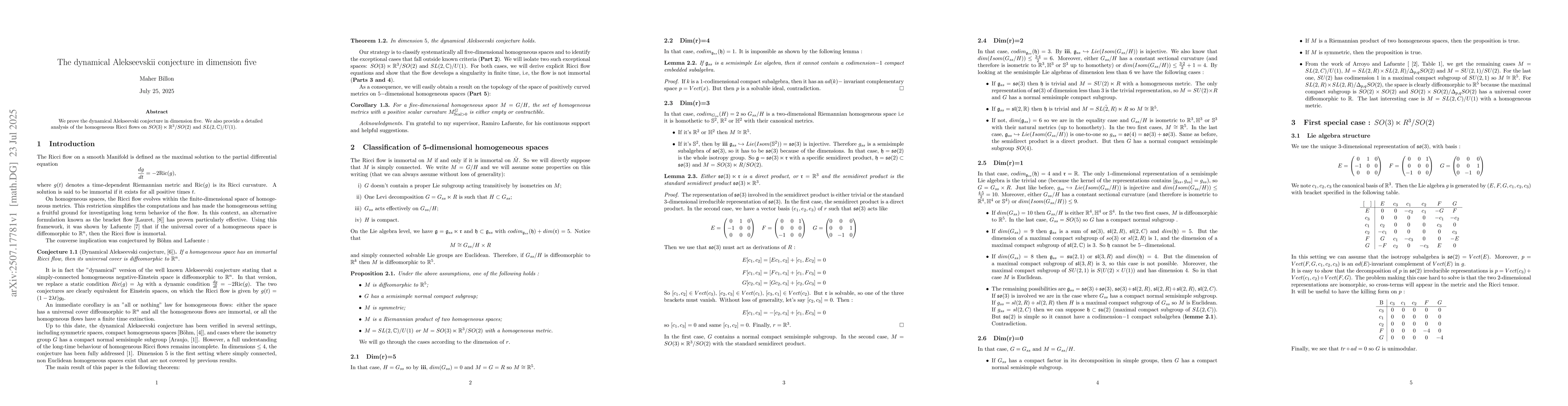 We prove the dynamical Alekseevski conjecture in dimension five. We also provide a detailed analysis of the homogeneous Ricci flows on $SO(3)\ltimes \mathbb{R}^3/SO(2)$ and $SL(2,\mathbb{C})/U(1)$.