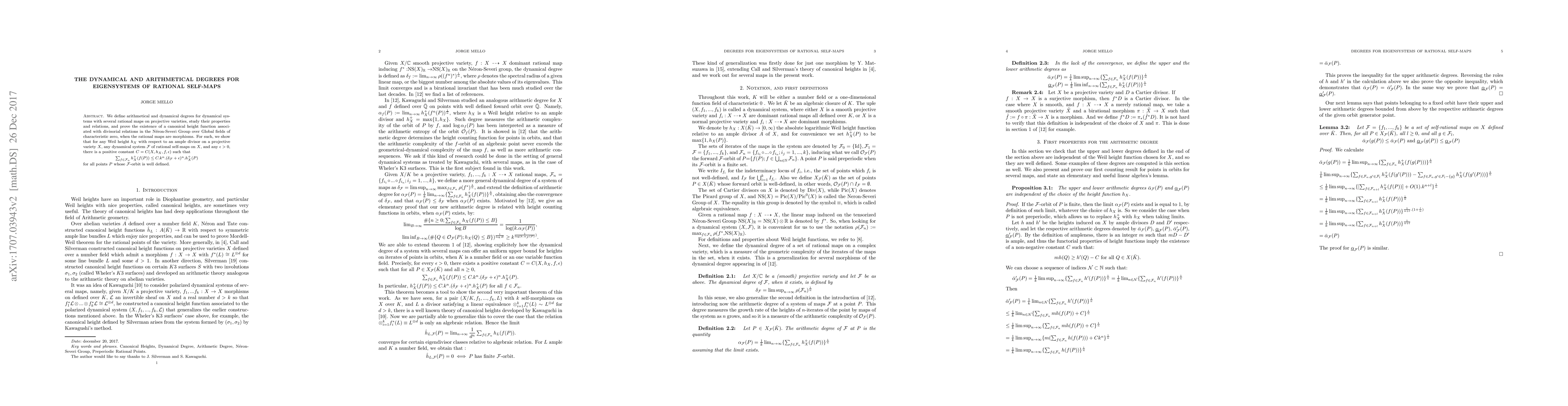 This paper introduces arithmetical and dynamical degrees for rational self-maps on projective varieties, establishing properties and relations of these degrees. It also proves the existence of a canonical height function linked to divisorial relations in the Néron-Severi Group over global fields of characteristic zero, demonstrating a bound on the sum of heights for points in the orbit of a dynamical system.