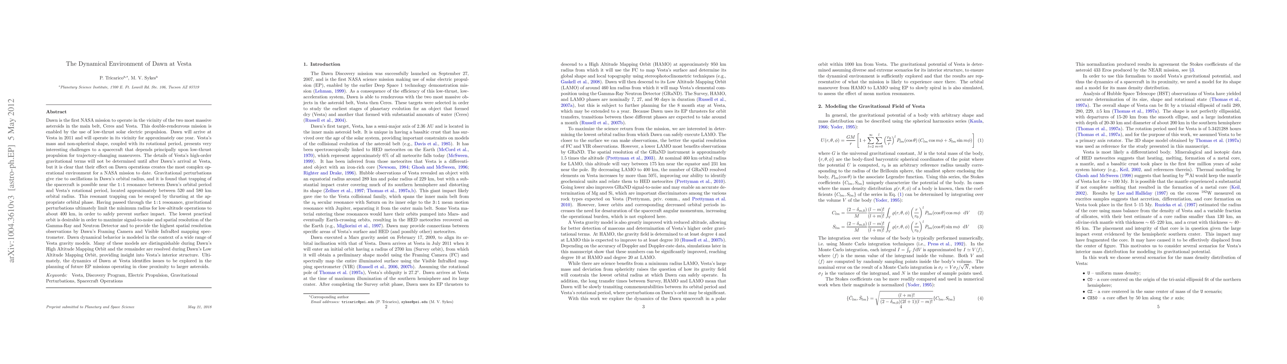 The Dawn mission explores Vesta's complex gravitational environment, revealing dynamical challenges due to the asteroid's mass, shape, and rotation. Gravitational perturbations create resonant trapping near the 1:1 orbital resonance, necessitating strategic thrusting to escape and safely operate at minimum altitudes of around 400 km.