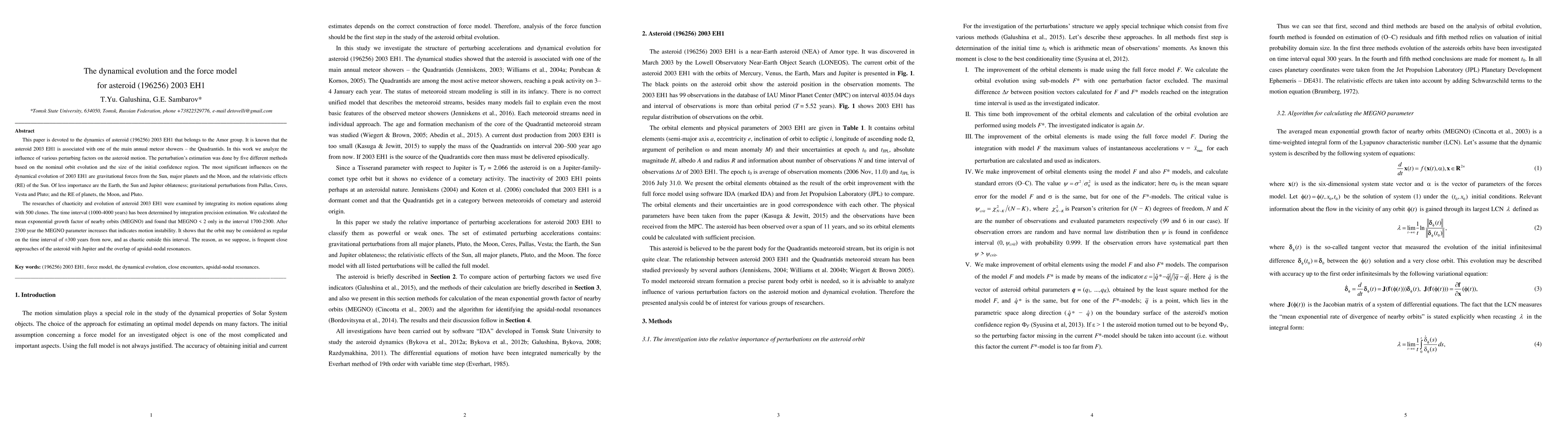 This paper is devoted to the dynamics of asteroid (196256) 2003 EH1 that belongs to the Amor group. It is known that the asteroid 2003 EH1 is associated with one of the main annual meteor showers the Quadrantids. In this work we analyze the influence of various perturbing factors on the asteroid motion. The perturbations estimation was done by five different methods based on the nominal orbit evolution and the size of the initial confidence region. The most significant influences on the dynamical evolution of 2003 EH1 are gravitational forces from the Sun, major planets and the Moon, and the relativistic effects (RE) of the Sun. Of less importance are the Earth, the Sun and Jupiter oblateness; gravitational perturbations from Pallas, Ceres, Vesta and Pluto; and the RE of planets, the Moon, and Pluto. The researches of chaoticity and evolution of asteroid 2003 EH1 were examined by integrating its motion equations along with 500 clones. The time interval (from 1000 to 4000 years) has been determined by integration precision estimation. We calculated the mean exponential growth factor of nearby orbits (MEGNO) and found that MEGNO less than two only in the interval from 1700 to 2300. After 2300 year the MEGNO parameter increases that indicates motion instability. It shows that the orbit may be considered as regular on the time interval of 300 years from now, and as chaotic outside this interval. The reason, as we suppose, is frequent close approaches of the asteroid with Jupiter and the overlap of apsidal nodal resonances.