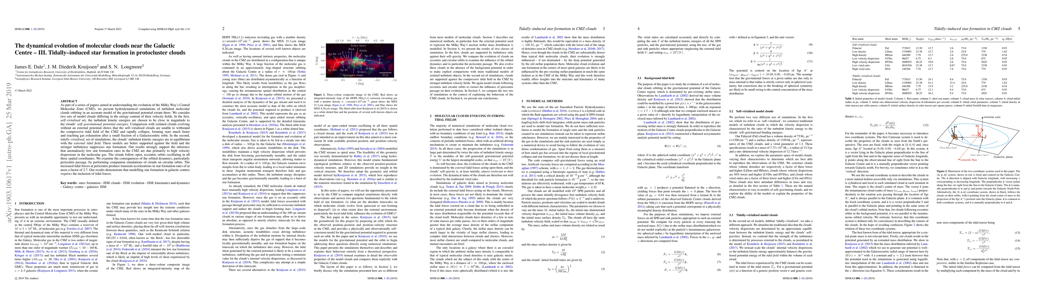 As part of a series of papers aimed at understanding the evolution of the Milky Way's Central Molecular Zone (CMZ), we present hydrodynamical simulations of turbulent molecular clouds orbiting in an accurate model of the gravitational potential extant there. We consider two sets of model clouds differing in the energy content of their velocity fields. In the first, self--virialised set, the turbulent kinetic energies are chosen to be close in magnitude to the clouds' self--gravitational potential energies. Comparison with isolated clouds evolving without an external potential shows that the self--virialised clouds are unable to withstand the compressive tidal field of the CMZ and rapidly collapse, forming stars much faster and reaching gas exhaustion after a small fraction of a Galactocentric orbit. In the second, tidally--virialised, set of simulations, the clouds' turbulent kinetic energies are in equilibrium with the external tidal field. These models are better supported against the field and the stronger turbulence suppresses star formation. Our results strongly support the inference that anomalously low star formation rates in the CMZ are due primarily to high velocity dispersions in the molecular gas. The clouds follow open, eccentric orbits oscillating in all three spatial coordinates. We examine the consequences of the orbital dynamics, particularly pericentre passage, by performing companion simulations of clouds on circular orbits. The increased tidal forces at pericentre produce transient accelerations in star formation rates of at most a factor of 2.7. Our results demonstrate that modelling star formation in galactic centres requires the inclusion of tidal forces.