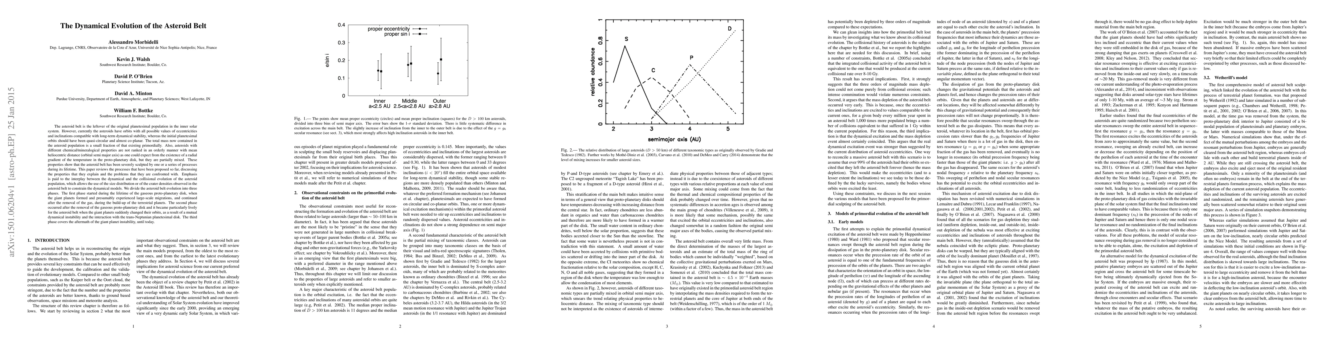 This paper reviews the dynamical evolution of the asteroid belt, detailing how it transformed from quasi-circular orbits to its current state through various processes, including giant planet migrations and collisions. It emphasizes the interplay between dynamical and collisional evolution, dividing the belt's history into three phases influenced by planetary migrations, giant planet instability, and ongoing evolution.