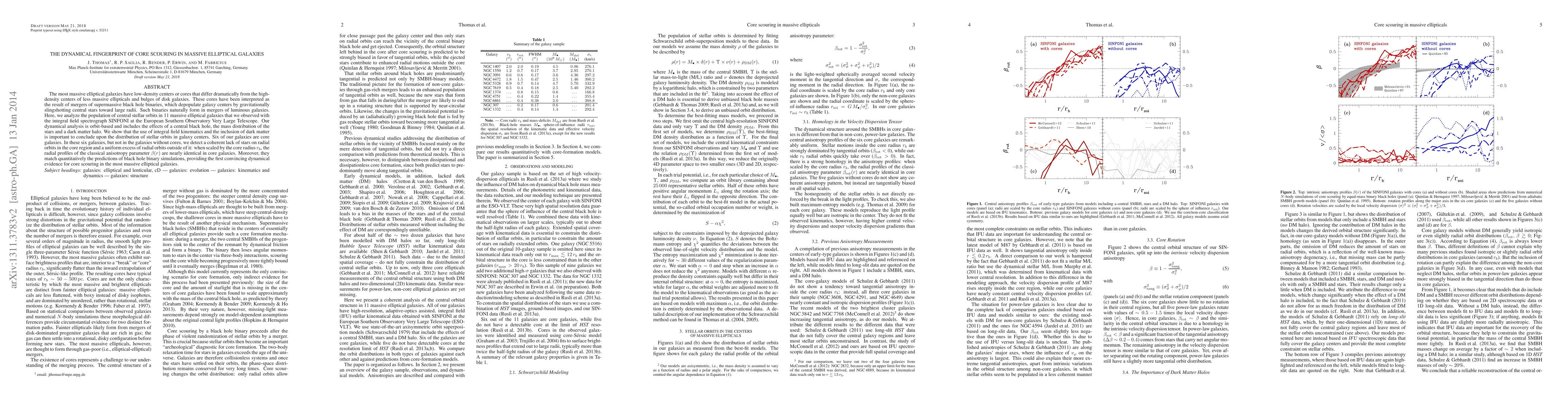 This paper investigates the dynamical fingerprints of core scouring in massive elliptical galaxies, revealing that six observed galaxies exhibit a lack of radial orbits within their cores and an excess outside, consistent with predictions from supermassive black hole binary mergers. The study emphasizes the importance of integral field kinematics and dark matter in understanding stellar orbit distributions.