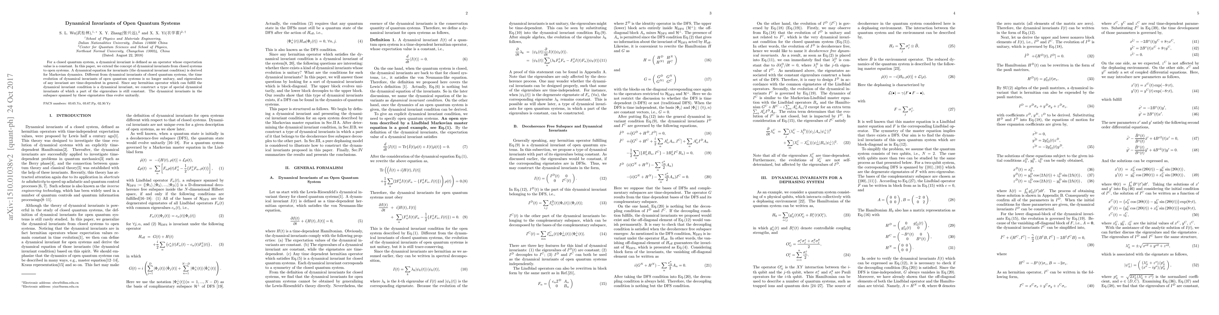 This paper generalizes the concept of dynamical invariants to open quantum systems, showing that while they remain constant in expectation, their evolution is non-unitary and time-dependent. It introduces a special type of dynamical invariant that remains constant in part, existing in decoherence-free subspaces where the evolution remains unitary.