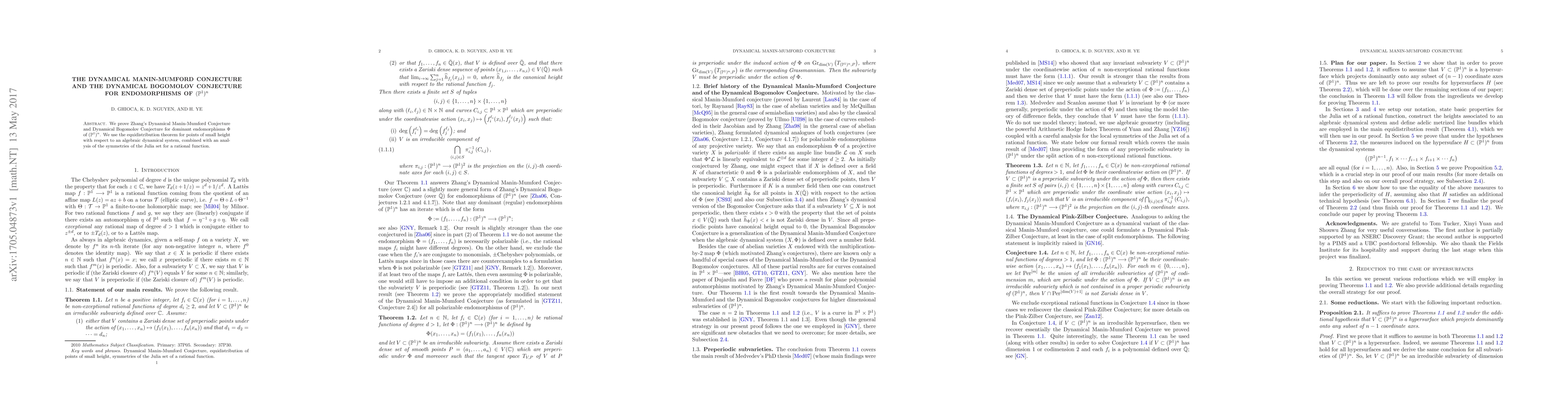 This paper proves Zhang's Dynamical Manin-Mumford and Dynamical Bogomolov Conjectures for dominant endomorphisms of (P^1)^n, leveraging the equidistribution theorem and an analysis of the symmetries of the Julia set for rational functions.