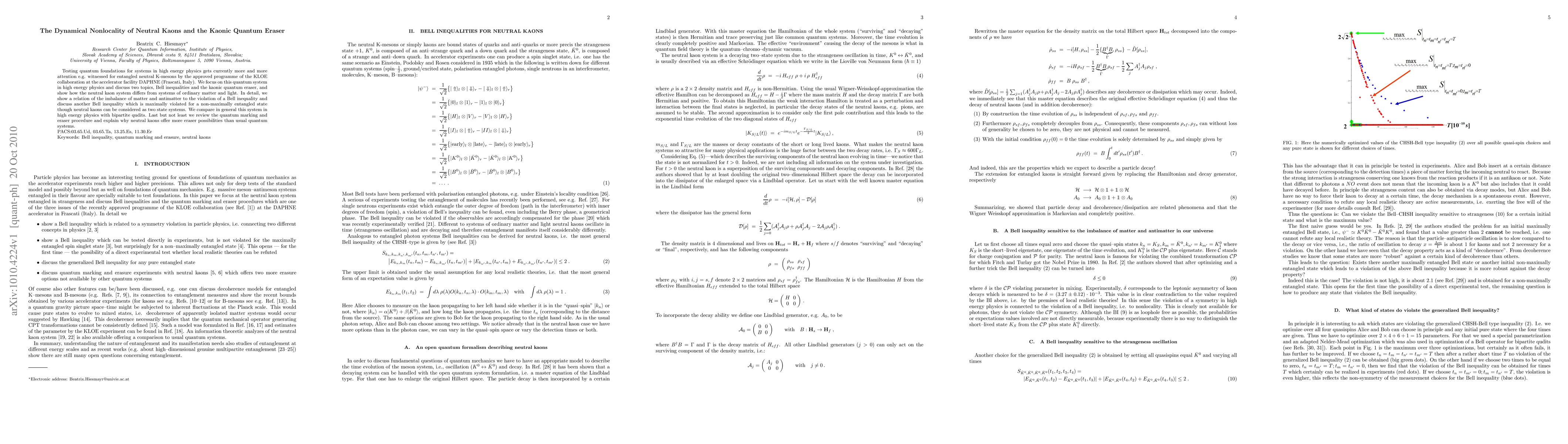 Testing quantum foundations for systems in high energy physics gets currently more and more attention e.g. witnessed for entangled neutral K-mesons by the approved programme of the KLOE collaboration at the accelerator facility DAPHNE (Frascati, Italy). We focus on this quantum system in high energy physics and discuss two topics, Bell inequalities and the kaonic quantum eraser, and show how the neutral kaon system differs from systems of ordinary matter and light. In detail, we show a relation of the imbalance of matter and antimatter to the violation of a Bell inequality and discuss another Bell inequality which is maximally violated for a non-maximally entangled state though neutral kaons can be considered as two state systems. We compare in general this system in high energy physics with bipartite qudits. Last but not least we review the quantum marking and eraser procedure and explain why neutral kaons offer more eraser possibilities than usual quantum systems.