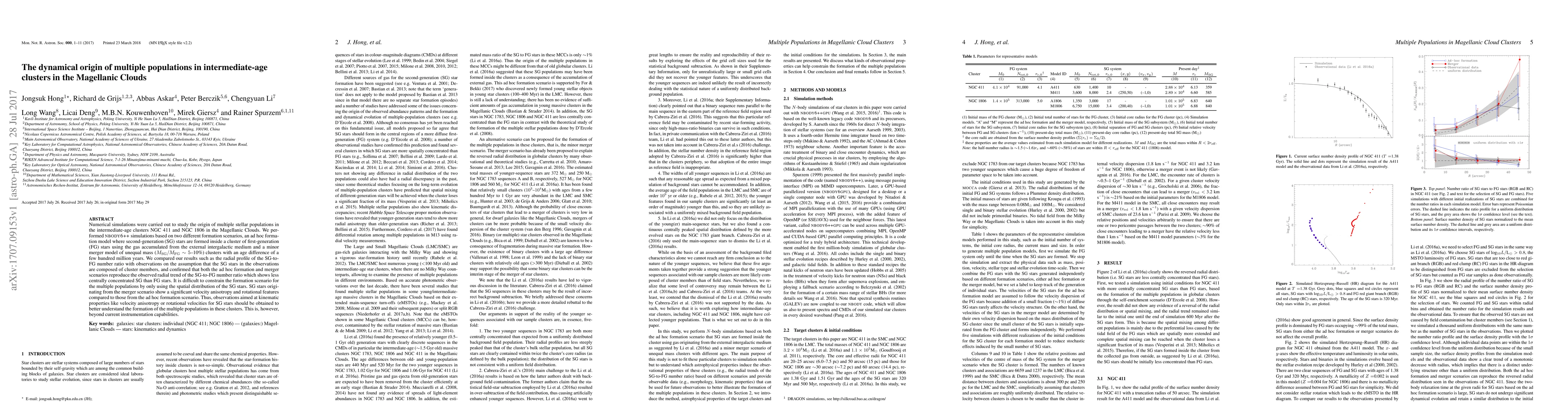 This paper uses numerical simulations to explore the origins of multiple stellar populations in intermediate-age clusters NGC 411 and NGC 1806 in the Magellanic Clouds, finding both ad hoc formation and merger scenarios can reproduce observed radial trends. To better distinguish between these scenarios, future observations of the kinematic properties of second-generation stars are recommended.
