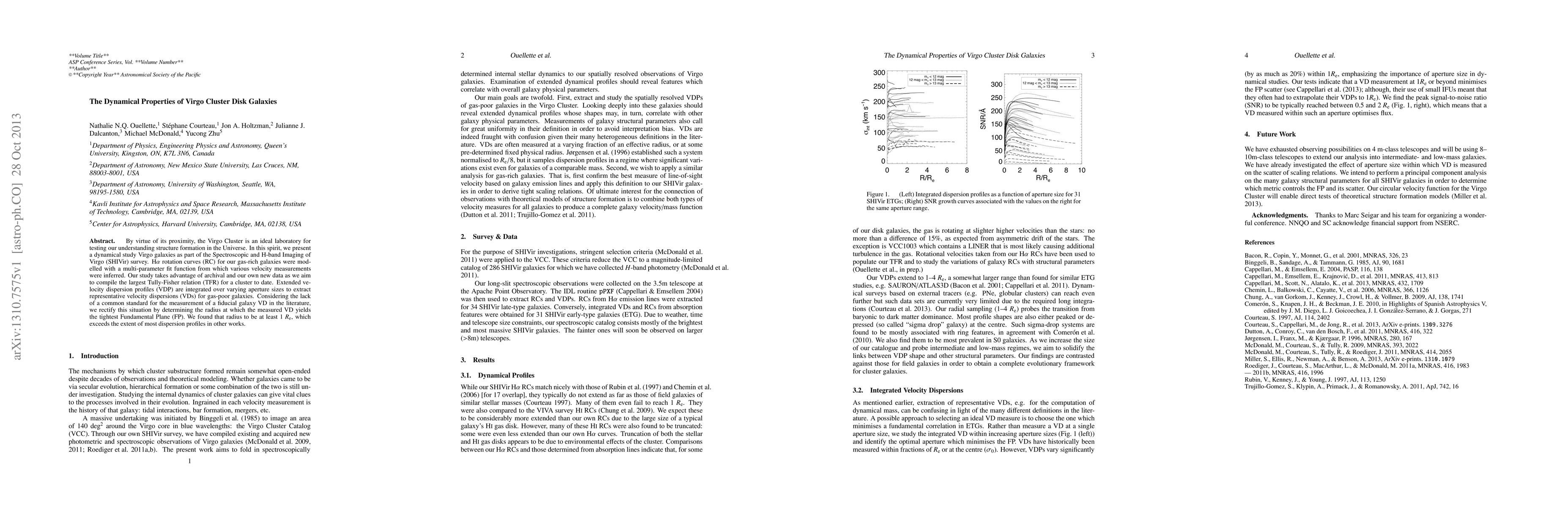 This study investigates the dynamical properties of disk galaxies in the Virgo Cluster using H$\alpha$ rotation curves and velocity dispersion profiles, aiming to compile the largest Tully-Fisher relation for a cluster. The research determines the radius yielding the tightest Fundamental Plane, finding it to be at least 1 $R_{\rm e}$.