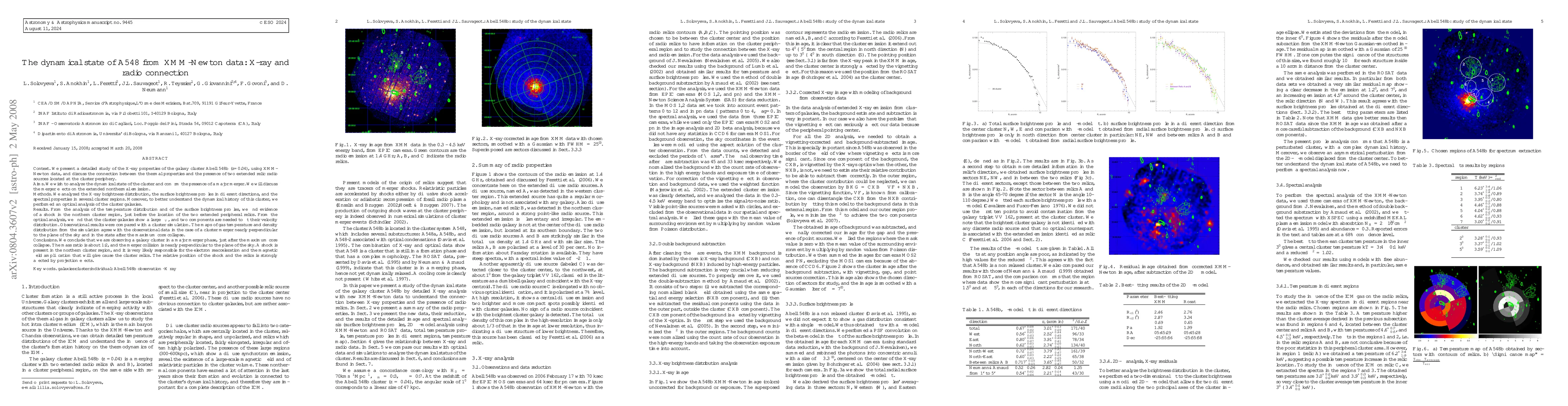 We present a detailed study of the X-ray properties of the galaxy cluster Abell 548b (z=0.04), using XMM-Newton data, and discuss the connection between the thermal properties and the presence of two extended relic radio sources located at the cluster periphery. We wish to analyze the dynamical state of the cluster and confirm the presence of a major merger. We will discuss the merger effects on the extended nonthermal emission. From the analysis of the temperature distribution and of the surface brightness profiles, we find evidence of a shock in the northern cluster region, just before the location of the two extended peripheral relics. From the optical analysis, we find that the cluster galaxies show a large $\sigma_V$, and two components are needed to fit their velocity distribution. Observational results were compared with a cluster simulation. The maps of gas temperature and density distribution from the simulation agree with the observational data in the case of a cluster merger nearly perpendicular to the plane of the sky and in the state after the maximum core collapse. We conclude that we are observing a galaxy cluster in a major merger phase, just after the maximum core collapse. The mass ratio is about 1:2, and the merger collision is nearly perpendicular to the plane of the sky. A shock is present in the northern cluster region, and it is very likely responsible for the electron reacceleration and the magnetic field amplification that will give cause the cluster relics. The relative position of the shock and the relics is strongly affected by projection effects.