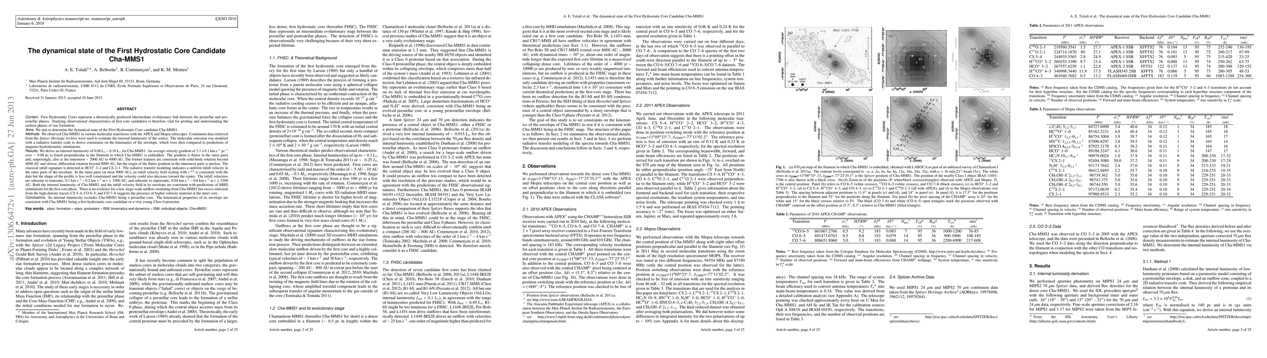 This study investigates the dynamical state of Cha-MMS1, a candidate for the First Hydrostatic Core, using observations from APEX and Mopra telescopes. The analysis reveals solid-body rotation beyond 4000 AU and differential rotation beyond 8000 AU, with a classical infall signature detected in HCO+ and CS transitions, consistent with MHD simulations for the first core phase.