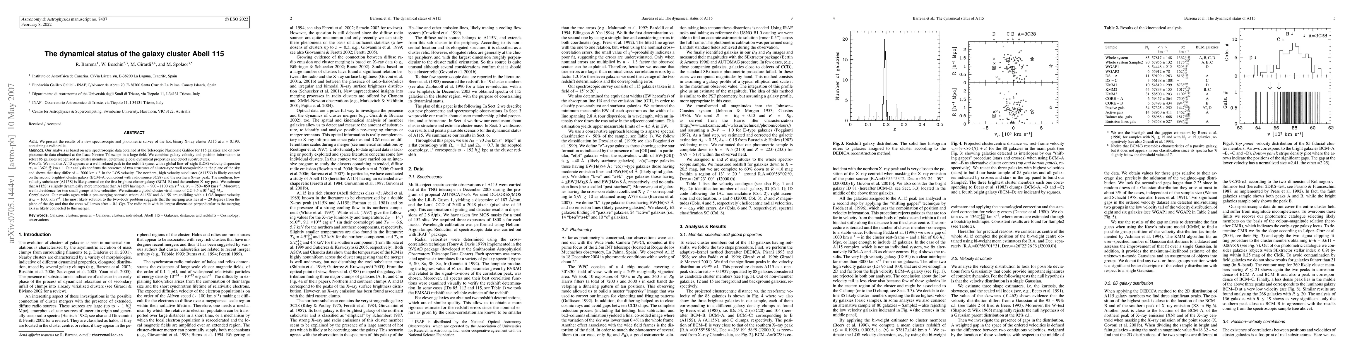 We present the results of a new spectroscopic and photometric survey of the hot, binary X-ray cluster A115 at z=0.193, containing a radio relic. We combine galaxy velocity and position information to select 85 galaxies recognized as cluster members (from 115 galaxies observed at TNG telescope), determine global dynamical properties and detect substructures. We find that A115 presents velocity dispersion of sigma_v=1362_{-108}^{+126} km/s. Our analysis confirms the presence of two structures (A115N and A115S) of cluster--type well recognizable in the plane of the sky and shows that they differ of ~2000 km/s in the LOS velocity. We estimate that A115S is slightly dynamically more important than A115N having sigma_v=900-1100 km/s vs sigma_v=750-850 km/s. Moreover, we find evidence for two small groups at low velocities. We estimate a global cluster virial mass of 2.2--3.5 e15 h_70 Msun. Our results agree with a pre--merging scenario where A115N and A115S are colliding with a LOS impact velocity Delta v~1600 km/s.The most likely solution to the two--body problem suggests that the merging axis lies at $\sim 20$ degrees from the plane of the sky and that the cores will cross after ~0.1 Gyr. The radio relic with its largest dimension perpendicular to the merging axis is likely connected to this merger.