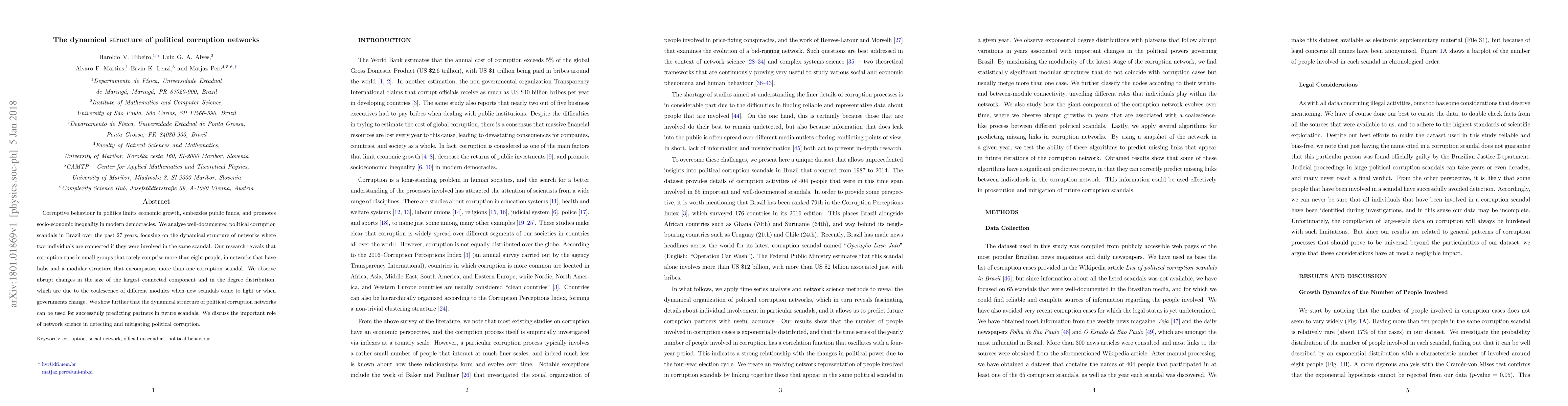 This research examines political corruption networks in Brazil, revealing that corruption typically occurs in small, modular groups with hubs, and that network dynamics change with new scandals or government shifts. The study demonstrates the potential of network analysis to predict future corruption partnerships.
