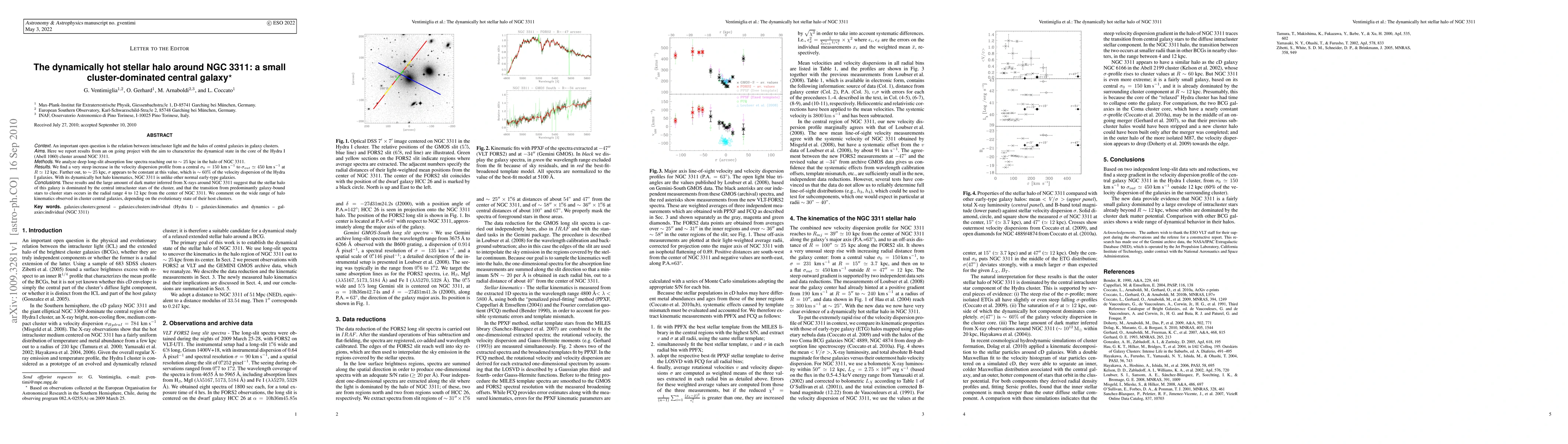 An important open question is the relation between intracluster light and the halos of central galaxies in galaxy clusters. Here we report results from an on going project with the aim to characterize the dynamical state in the core of the Hydra I (Abell 1060) cluster around NGC 3311. Methods: We analyze deep long-slit absorption line spectra reaching out to ~25 kpc in the halo of NGC 3311. Results: We find a very steep increase in the velocity dispersion profile from a central sigma_0=150 km/s to sigma_out ~450 km/s at R ~ 12 kpc. Farther out, to ~25 kpc, sigma appears to be constant at this value, which is ~60% of the velocity dispersion of the Hydra I galaxies. With its dynamically hot halo kinematics, NGC 3311 is unlike other normal early-type galaxies. Conclusions: These results and the large amount of dark matter inferred from X-rays around NGC 3311 suggest that the stellar halo of this galaxy is dominated by the central intracluster stars of the cluster, and that the transition from predominantly galaxy-bound stars to cluster stars occurs in the radial range 4 to 12 kpc from the center of NGC 3311. We comment on the wide range of halo kinematics observed in cluster central galaxies, depending on the evolutionary state of their host clusters.