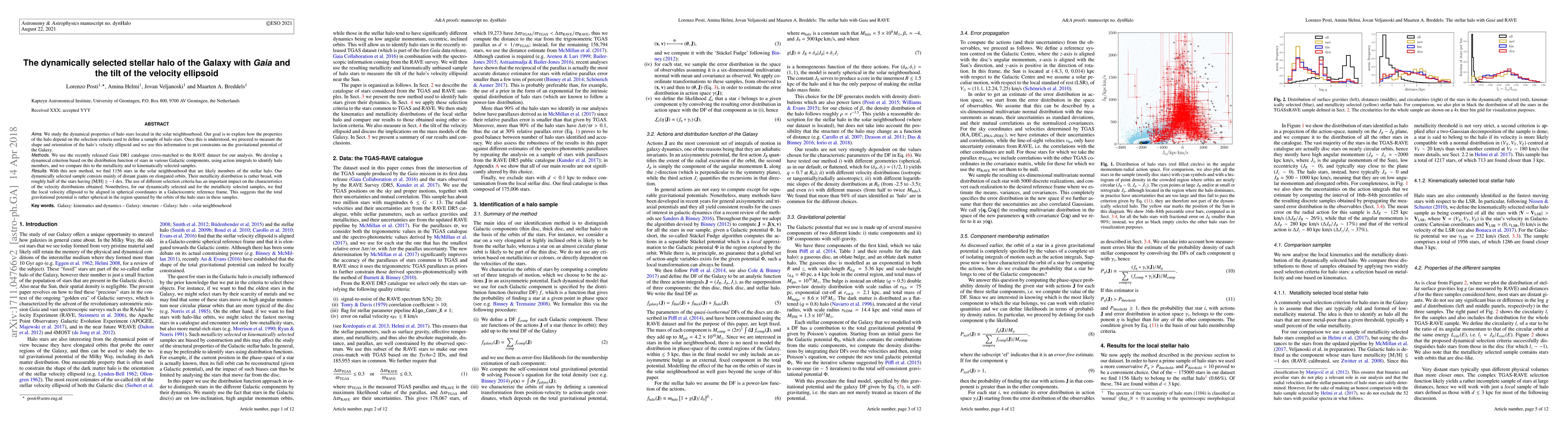 We study the dynamical properties of halo stars located in the Solar Neighbourhood. Our goal is to explore how the properties of the halo depend on the selection criteria used for defining a sample of halo stars. Once this is understood we proceed to measure the shape and orientation of the halo's velocity ellipsoid and we use this information to put constraints on the gravitational potential of the Galaxy. We use the recently released Gaia DR1 catalogue cross-matched to the RAVE dataset for our analysis. We develop a dynamical criterion based on the distribution function of stars in various Galactic components, using action integrals to identify halo members, and compare this to metallicity and to kinematically selected samples. With this new method, we find 1156 stars in the Solar Neighbourhood to be likely members of the stellar halo. Our dynamically selected sample consists mainly of distant giants on elongated orbits. Their metallicity distribution is rather broad, with roughly half of the stars having [M/H] $\ge -1$ dex. The use of different selection criteria has an important impact on the characteristics of the velocity distributions obtained. Nonetheless, for our dynamically selected and for the metallicity selected samples, we find the local velocity ellipsoid to be aligned in spherical coordinates in a Galactocentric reference frame: this suggests that the total gravitational potential is rather spherical in the region spanned by the orbits of the halo stars in these samples.