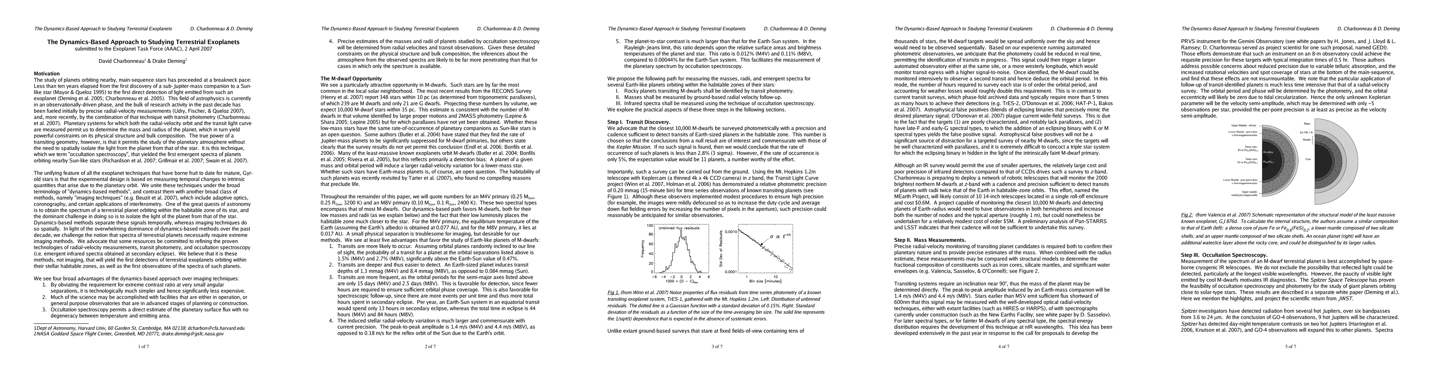 One of the great quests of astronomy is to obtain the spectrum of a terrestrial planet orbiting within the habitable zone of its star, and the dominant challenge in doing so is to isolate the light of the planet from that of the star. Dynamics-based methods separate these signals temporally, whereas imaging techniques do so spatially. In light of the overwhelming dominance of dynamics-based methods over the past decade, we challenge the notion that spectra of terrestrial planets necessarily require extreme imaging methods. We advocate that some resources be committed to refining the proven technologies of radial-velocity measurements, transit photometry, and occultation spectroscopy (i.e. emergent infrared spectra obtained at secondary eclipse). We see a particularly attractive opportunity in M-dwarfs, for which the habitable zone is close to the star, increasing the probability and frequency of transits, and the amplitude of the induced radial-velocity variation. Such planets could be discovered by a dedicated ground-based transit survey of the 10,000 nearest M-dwarfs. The favorable planet-star contrast ratio would make these planets ideal targets for the study of their atmospheres with the technique of occultation spectroscopy.