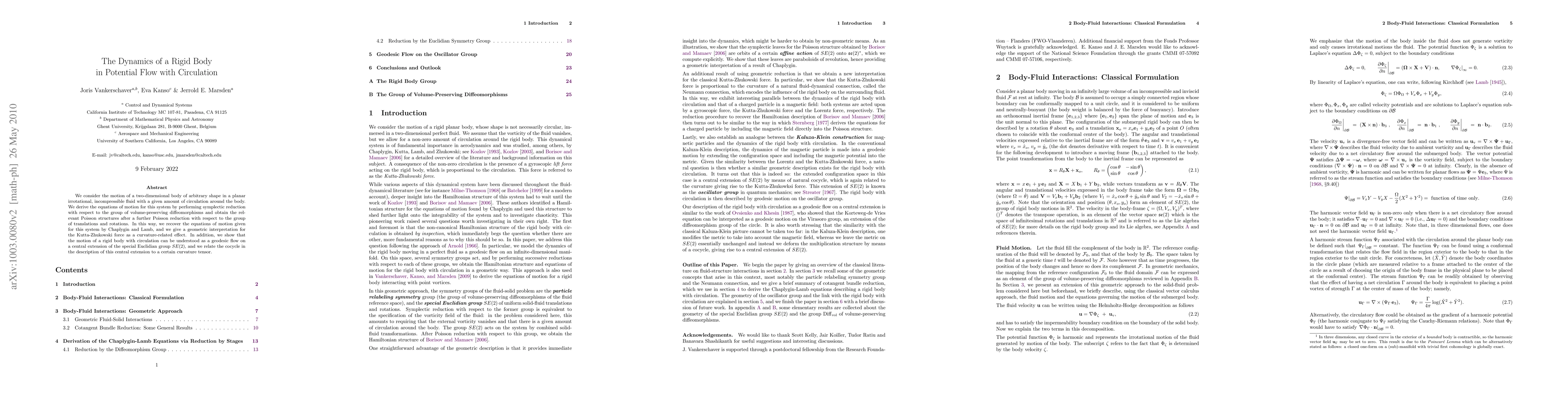 This paper derives the equations of motion for a rigid body in potential flow with circulation using symplectic reduction, recovering Chaplygin and Lamb's results and providing a geometric interpretation of the Kutta-Zhukowski force. It also shows the motion can be viewed as a geodesic flow on a central extension of the special Euclidean group SE(2).