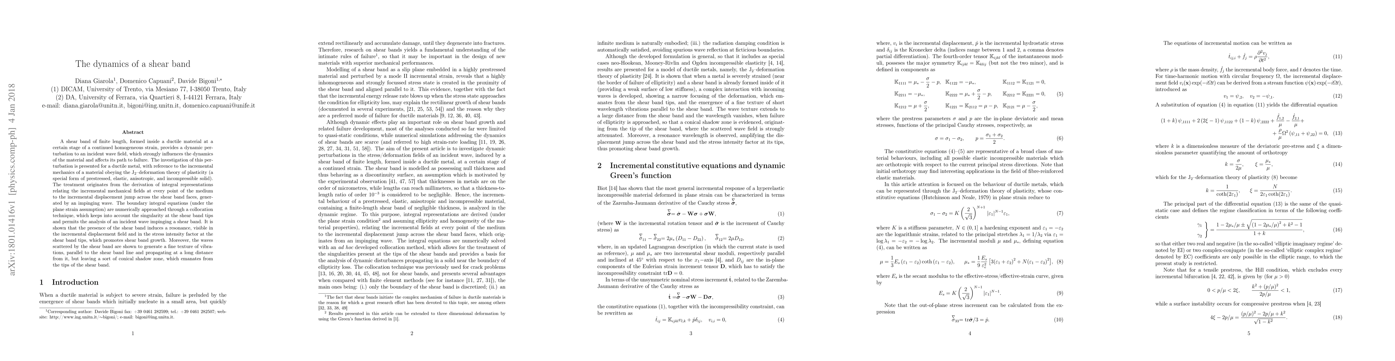 A shear band of finite length, formed inside a ductile material at a certain stage of a con- tinued homogeneous strain, provides a dynamic perturbation to an incident wave field, which strongly influences the dynamics of the material and affects its path to failure. The investigation of this perturbation is presented for a ductile metal, with reference to the incremental mechanics of a material obeying the J 2-deformation theory of plasticity (a special form of prestressed, elastic, anisotropic, and incompressible solid). The treatment originates from the derivation of integral representations relating the incremental mechan- ical fields at every point of the medium to the incremental displacement jump across the shear band faces, generated by an impinging wave. The boundary integral equations (under the plane strain assumption) are numerically approached through a collocation technique, which keeps into account the singularity at the shear band tips and permits the analysis of an incident wave impinging a shear band. It is shown that the presence of the shear band induces a resonance, visible in the incremental displacement field and in the stress intensity factor at the shear band tips, which promotes shear band growth. Moreover, the waves scattered by the shear band are shown to generate a fine texture of vibrations, par- allel to the shear band line and propagating at a long distance from it, but leaving a sort of conical shadow zone, which emanates from the tips of the shear band.