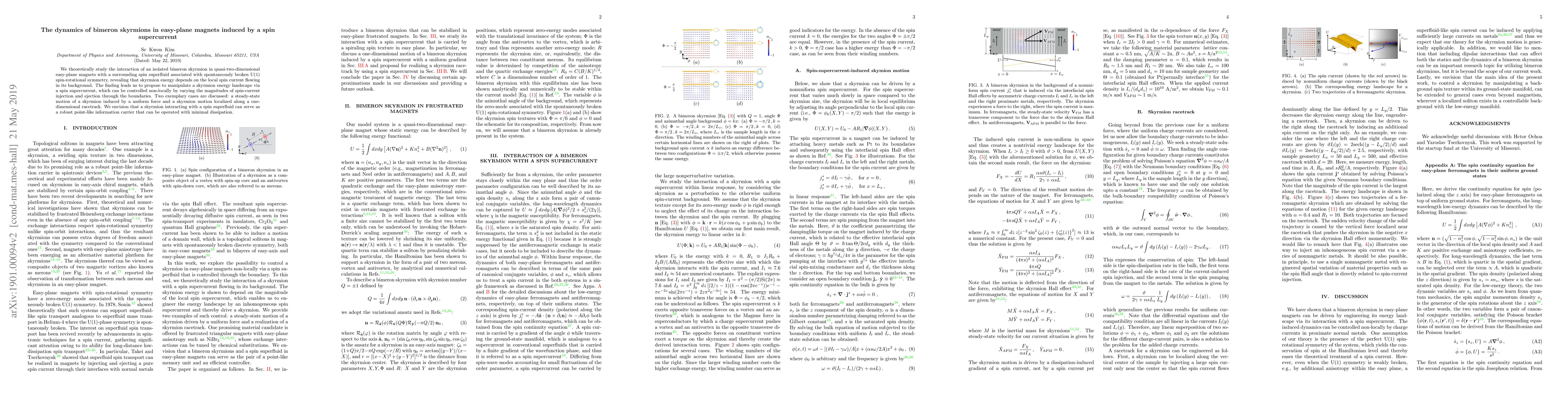 This paper investigates the interaction of bimeron skyrmions in easy-plane magnets with a spin supercurrent, showing that skyrmion energy is influenced by local spin currents. The authors propose manipulating skyrmion energy landscapes via spin supercurrents, suggesting potential for low-dissipation information carriers.